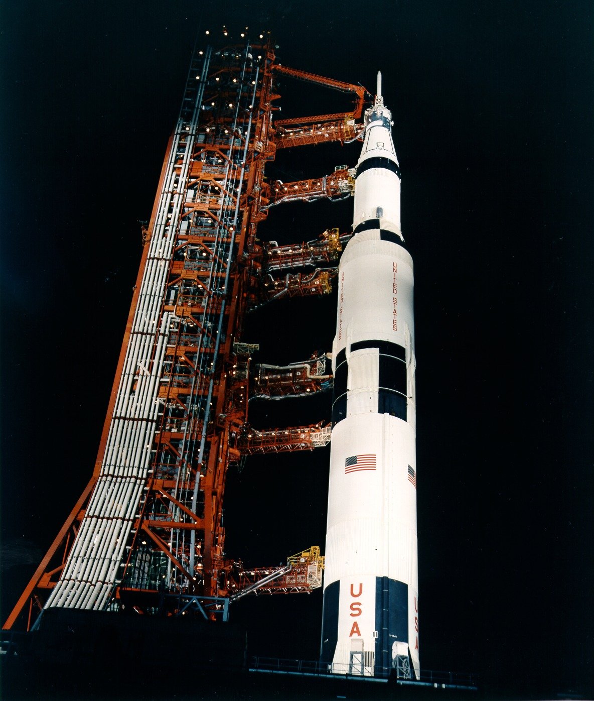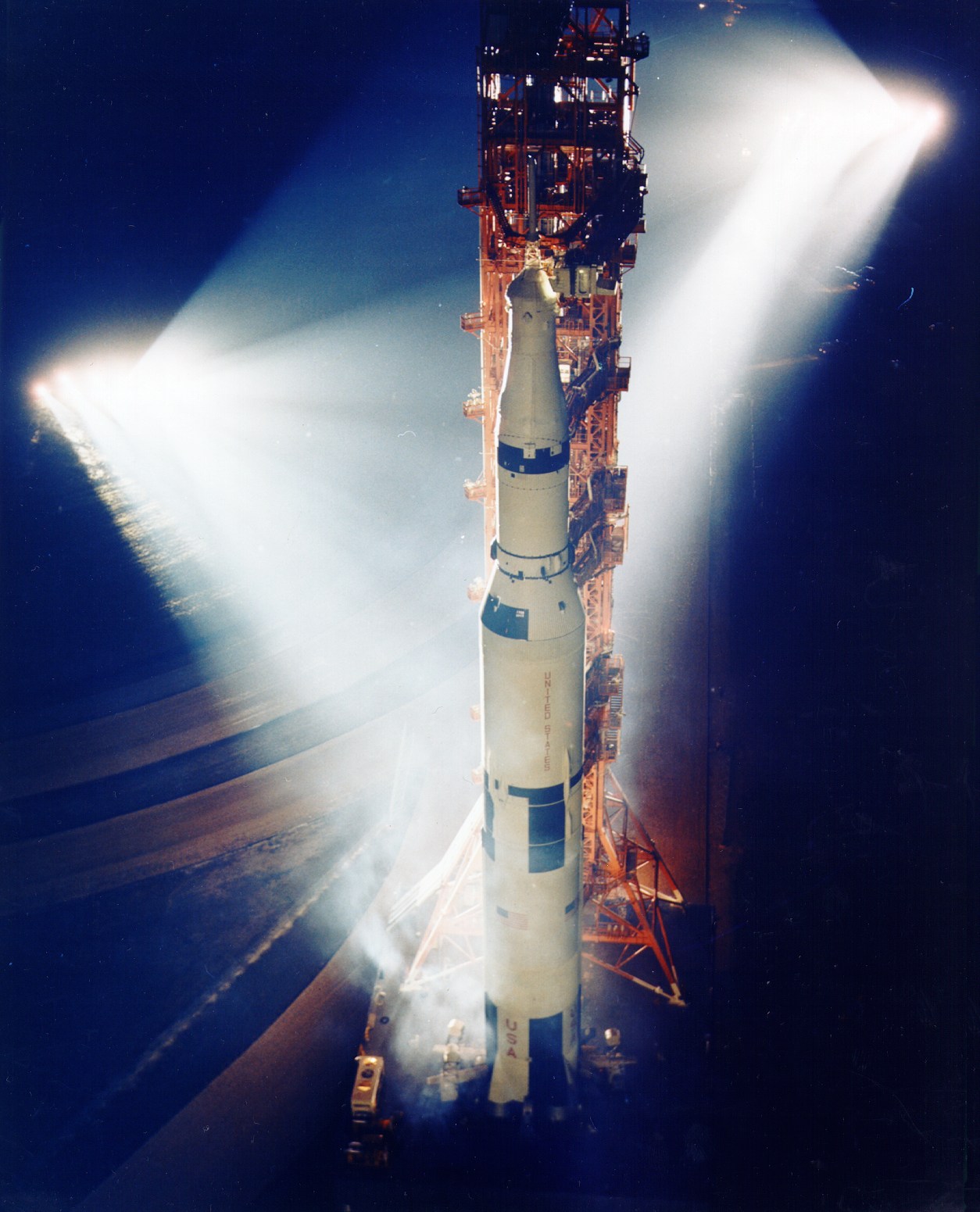 Apollo 13 Saturn V spotlit on the launch pad. Scan by Kipp Teague.