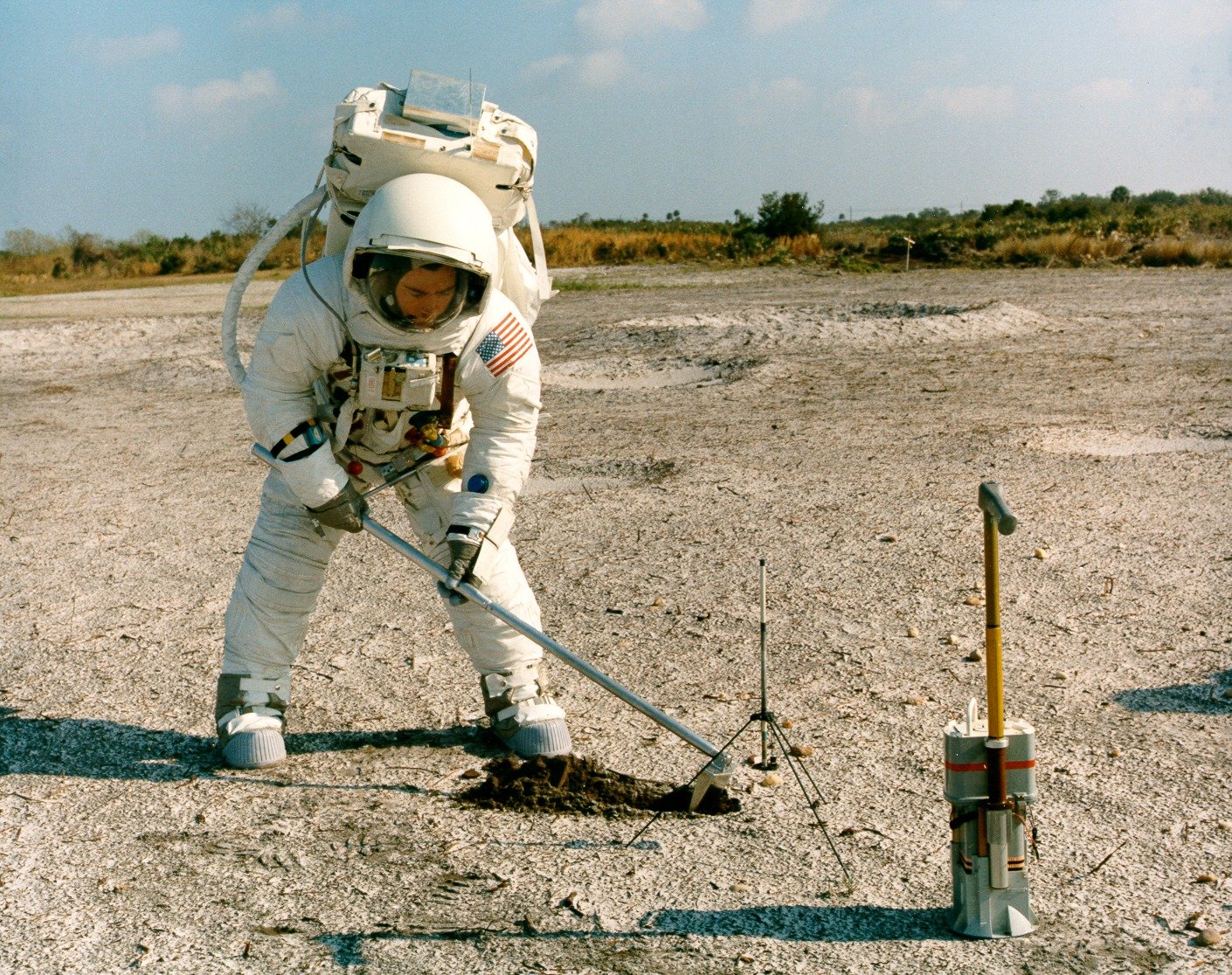 Apollo 13 Backup Commander John Young practices trenching at the Cape. The type of long-handled scoop shown here was never used on the Moon. The Apollo Lunar Surface Close-up Camera is to the right of the gnomon. Note that John does not have distinguishing stripes on his suit at this time. 19 February 1970. Scan by Kipp Teague.KSC-70PC-63 (0.3 Mb or 2.8 Mb)