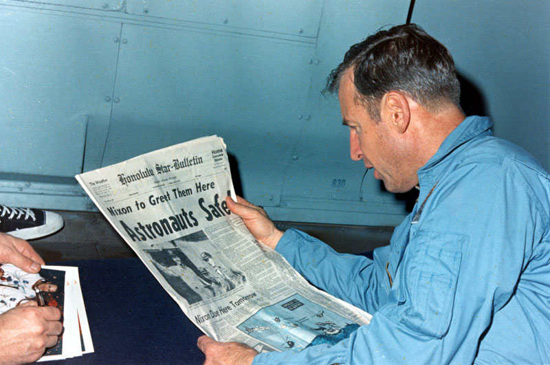 Jim Lovell reads a newspaper account of the Apollo 13 recovery. 17 April 1970. Scan by Ed Hengeveld.S70-16004 ( 297k )