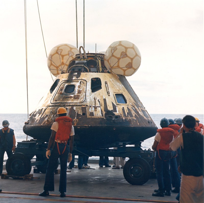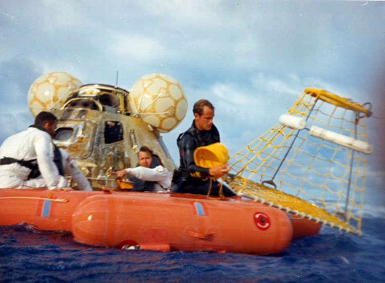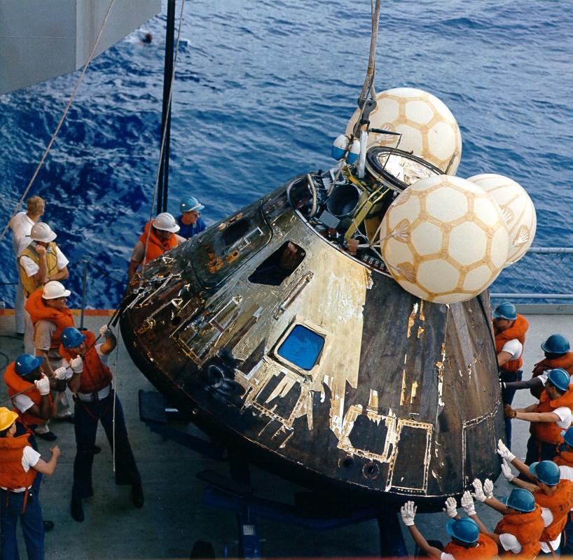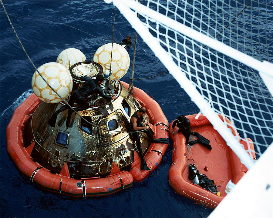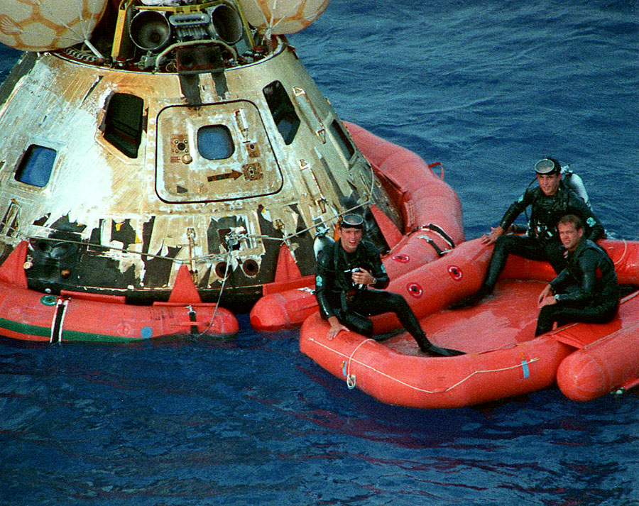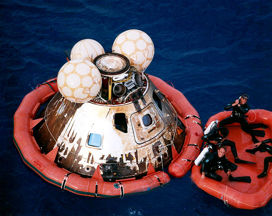 Navy divers pose with the Command Module before it is hoisted aboard the Iwo Jima. 17 April 1970. Scan by J.L. Pickering.S70-16000 ( 224k )