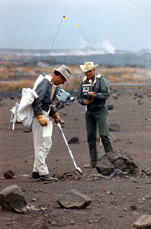 Fred Haise (left) and Jim Lovell during a geology training traverse at Kapoho, Hawaii. They have a Hand Tool Carrier (HTC), are wearing Hasselblads, and have radio aerials so they can talk to the geology support team practicing the Backroom role. 17-20 December 1969. Scan by J.L. Pickering.CM Training ( 115k )