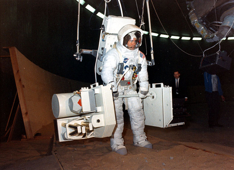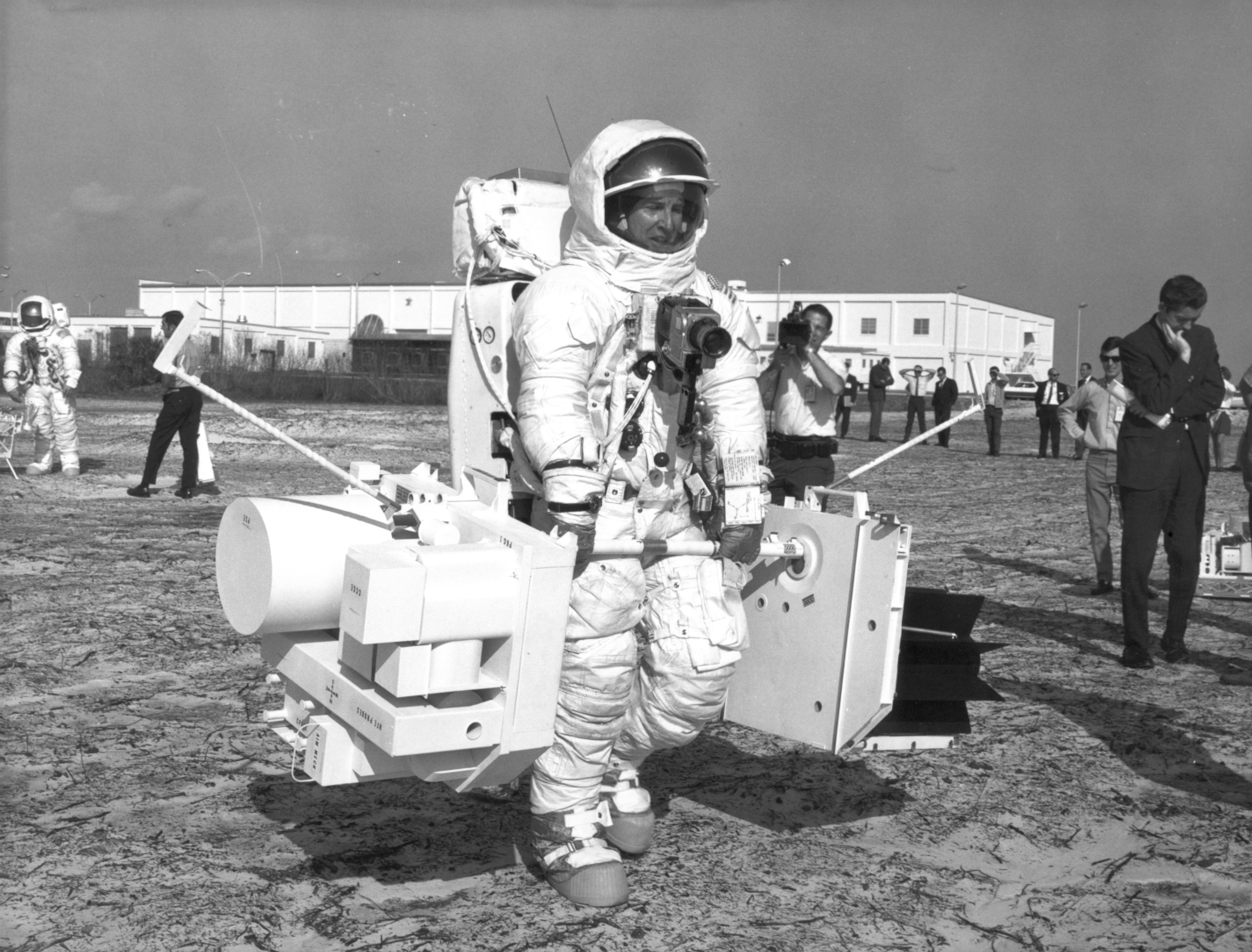 NASA caption, 28 January 1970: "Fred W. Haise Jr., Apollo 13 Lunar Module Pilot, participated in a walk-through of the extravehicular activity timeline near the flight crew training building here today. In the foreground is the lunar surface tool carrier, topped by auger-like pipes, to be used with a motorized device to obtain soil sample cores in the Moon’s rugged Fra Mauro region. Apollo 13 is scheduled for launch from Complex 39’s Pad A no earlier than April 13. The other crew members are James A. Lovell, Jr., commander, and Thomas K. Mattingly II, Command Module pilot." Note that Haise has a 16-mm DAC movie camera mounted on his RCU bracket. The featureless box mounted on the camera of Haise's right is a battery for the DAC. Scan courtesy Margaret Persinger, KSC.KSC-70P-46 ( 132k )