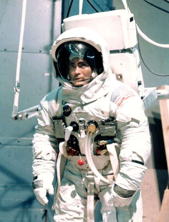 Fred Haise poses at the launch pad. 6 April 1970. Scan by J.L. Pickering.KSC-70PC-72 ( 100k )