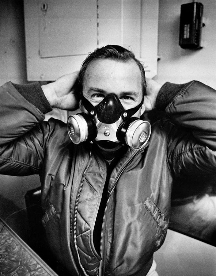 Jim Lovell poses in an oxygen mask aboard 'Retriever'. 24 February 1970. Scan by J.L. Pickering.70-H-257 ( 89k or 675k )