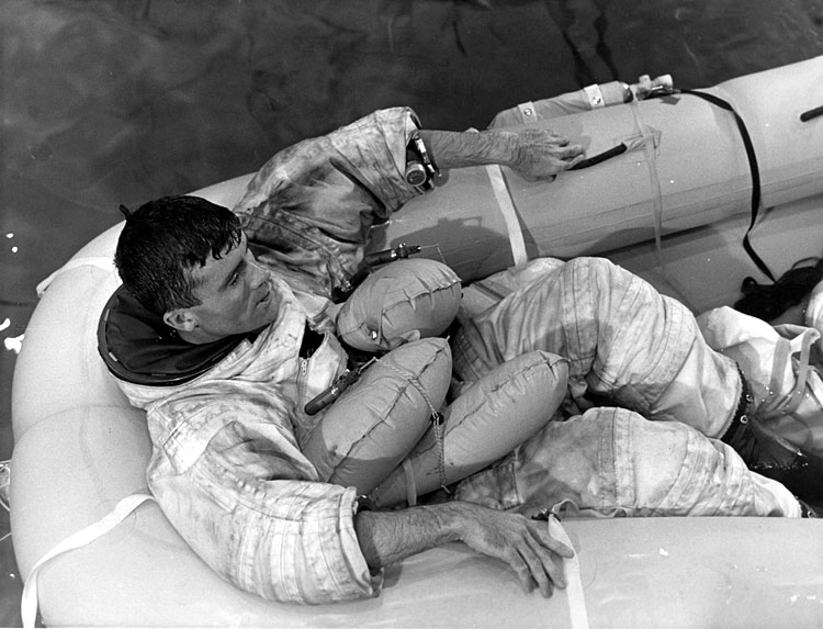 Fred Haise in a recovery raft during training, probably in an indoor pool. 17 January 1970. Scan by Ed Hengeveld.70-H-182 ( 103k or 823k )
