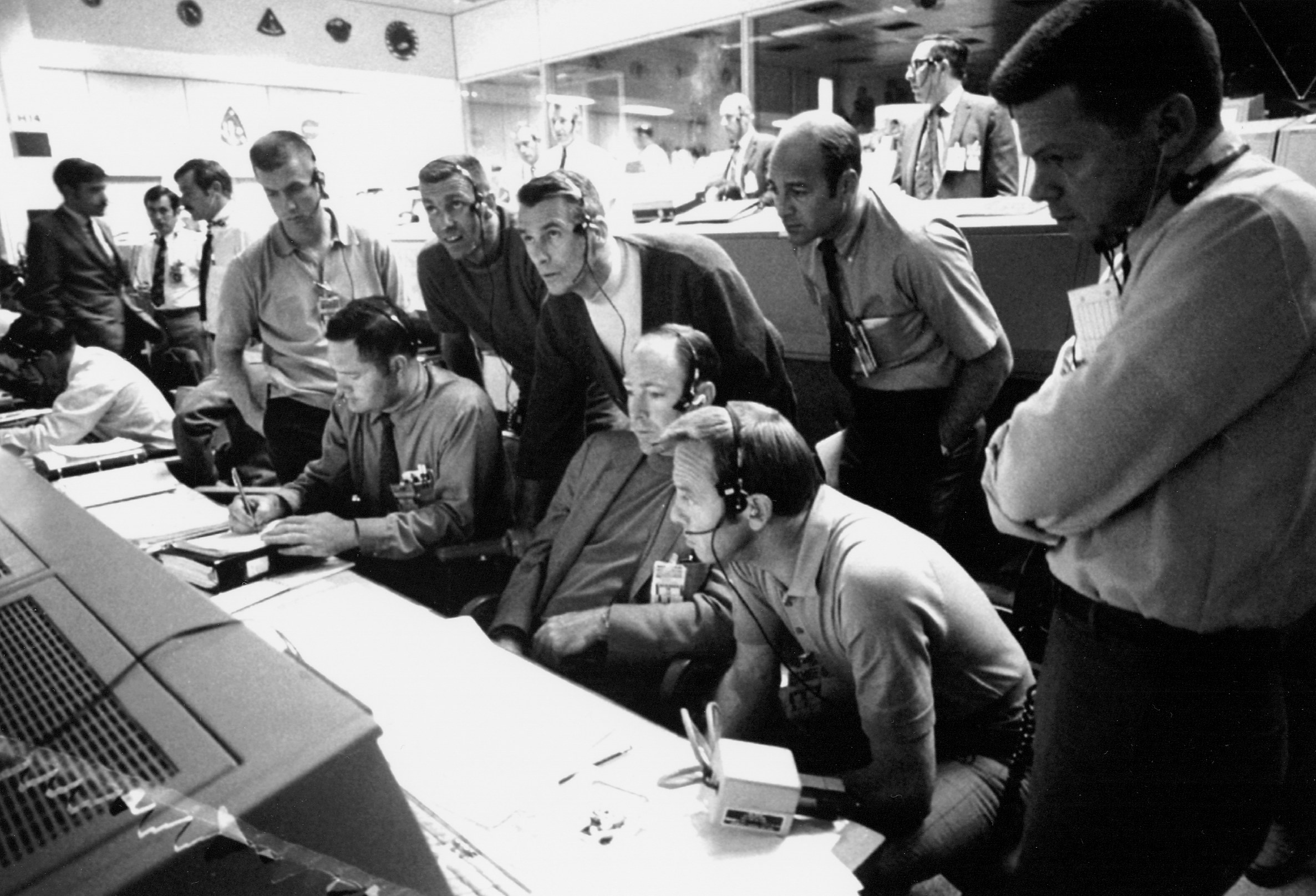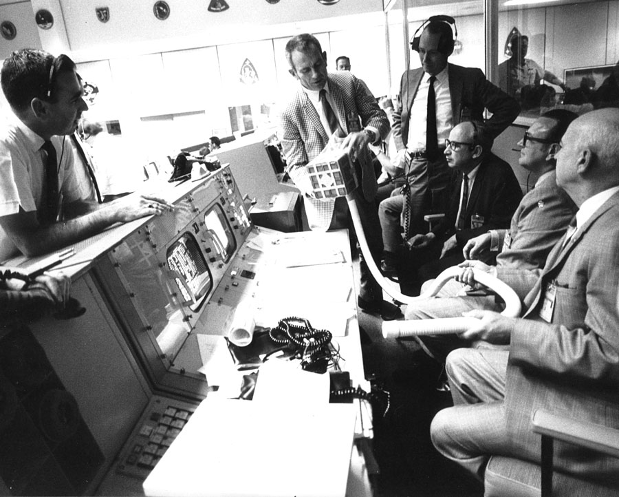 (NASA Caption) "A group of eight astronauts and flight controllers monitor the console activity in the Mission Operations Control Room (MOCR) of the Mission Control Center (MCC) during the Apollo 13 lunar landing mission. Seated, left to right, are MOCR Guidance Officer Raymond F. Teague; Astronaut Edgar D. Mitchell, and Astronaut Alan B. Shepard Jr., Standing, left to right, are Scientist-Astronaut Anthony W. England; Astronaut Joe H. Engle; Astronaut Eugene A. Cernan; Astronaut Ronald E. Evans; and M.P. Frank, a flight controller. When this picture was made, the Apollo 13 moon landing had already been cancelled, and the Apollo 13 crewmen were in transearth trajectory attempting to bring their crippled spacecraft back home." Mitchell and Shepard, along with Stu Roosa, are the Apollo 14 Prime Crew and Cernan, Evans, and Engle the Apollo 14 Back-up Crew. Tony England, who confirmed the following in a January 2006 e-mail, was to have been the Apollo 13 EVA CapCom; and later, at the request of John Young who was the Backup Commander on Apollo 13, Tony served with distinction as Mission Scientist and EVA CapCom on Apollo 16. 13 April 1970. Scan by Kipp Teague.S70-35583 ( 164k )