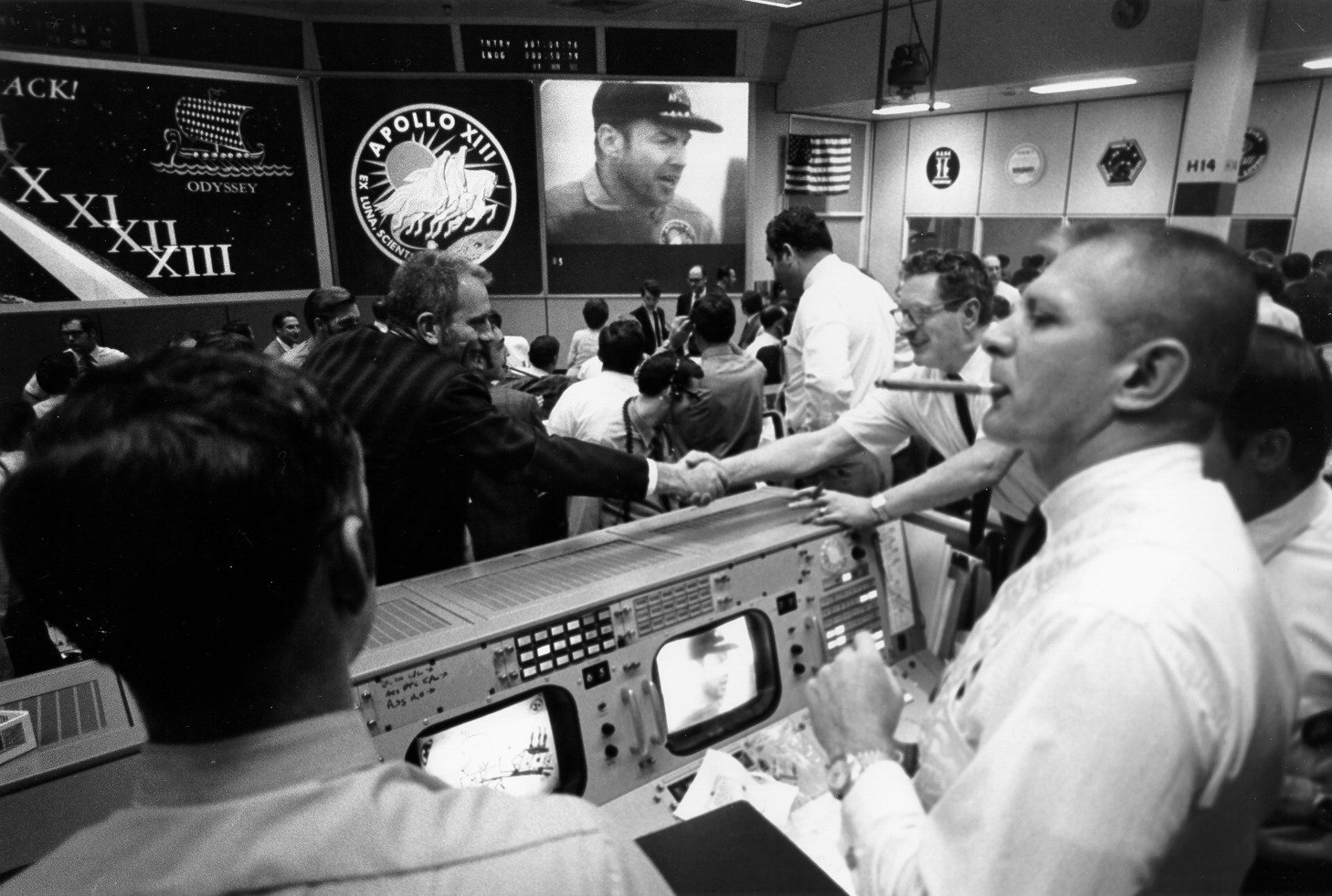 Mission Control in Houston celebrates the safe return of the Apollo 13 crew. Gene Kranz is smoking a celebratory cigar at the right while Deke Slayton, in front of the mission patch, shakes hands. 17 April 1970. Scan by Kipp Teague.70-H-652 ( 186k or 1288k )