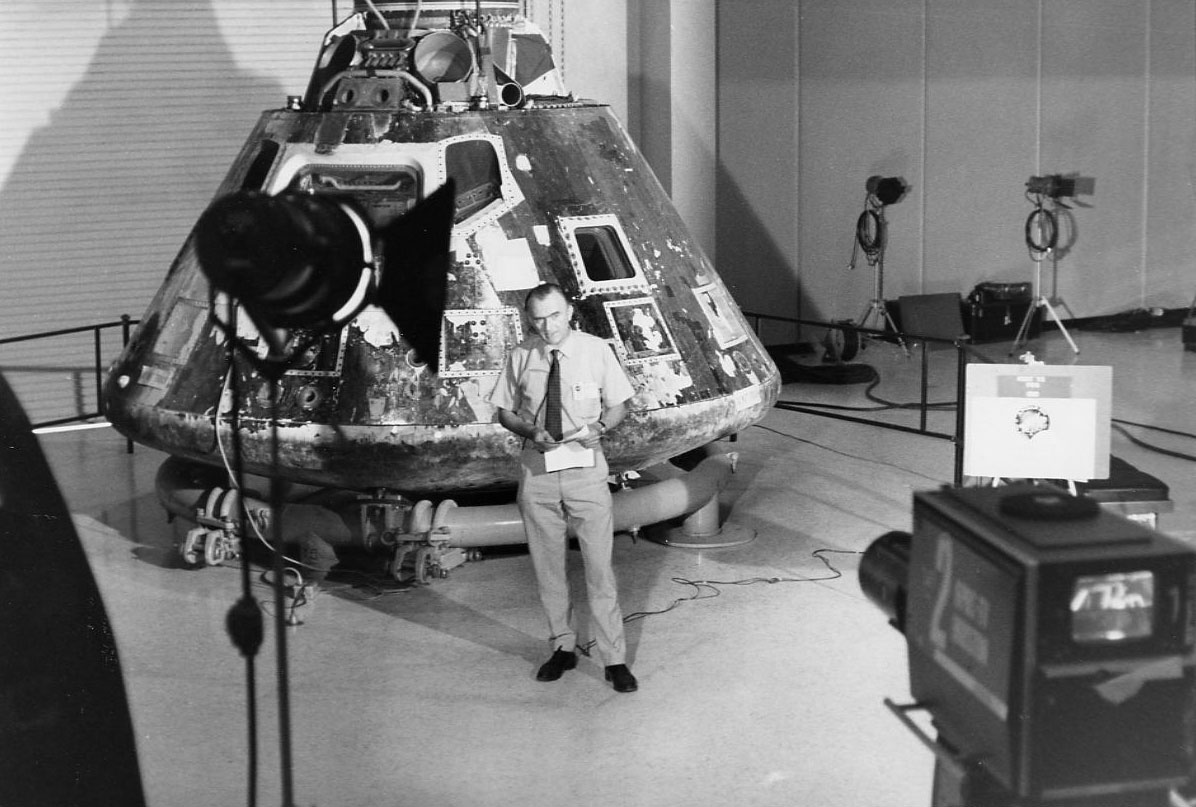 Standing in front of the Apollo 9 CM at the Manned Spacecraft Center, Reginald Turnhill of the BBC makes a tape for TV transmission back to his home country during the Apollo 13 mission.. Scan by J.L. Pickering.Kipp Teague has posted unprocessed, high-resolution scans provided by NASA Johnson of all the Apollo Hasselblad images. The scans are available at https://www.flickr.com/photos/projectapolloarchive/albums