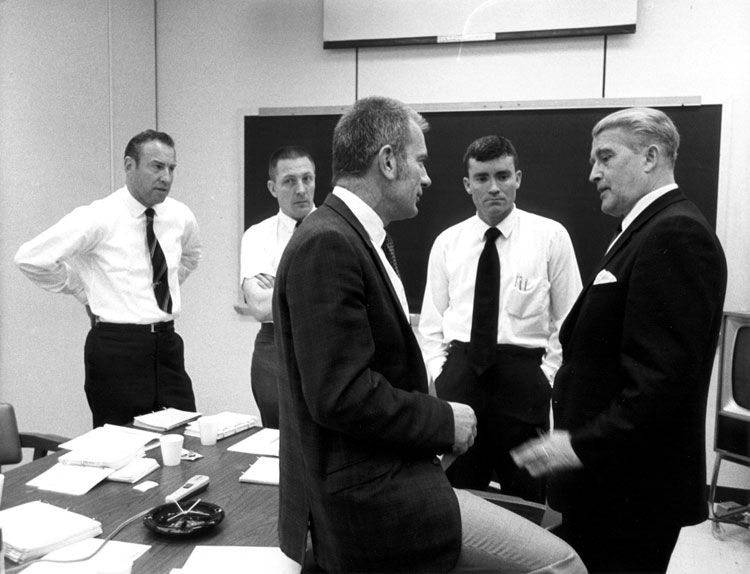 Deke Slayton (center foreground), Jim Lovell (left rear), Jack Swigert (center rear), and Fred Haise (center right) meet with Wernher von Braun in Houston. 20 April 1970. Scan by Ed Hengeveld.S70-51890 ( 168k )