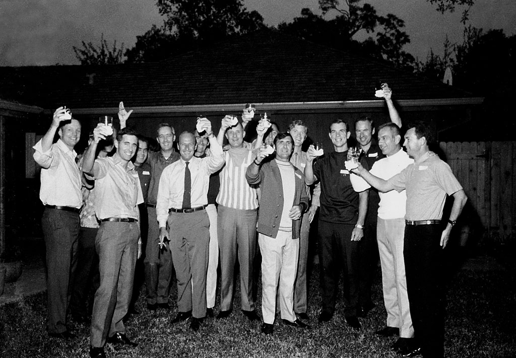 Apollo astronauts and Soyuz 9 crew at a backyard party: (left-to-right) Armstrong, Aldrin, Anders, Nikolayev, McDivitt, Conrad, Cunningham, Stafford, Swigert, Gordon, Schweickart, Scott, Lovell, Slayton, Sevastyanov. 1970. Photo research by Jim Murray and Peter Duncan. Scan by Kipp Teague.21st Astronautical Congress ( 2.8 Mb )