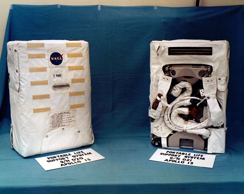 Pre-flight views of the back of Fred Haise's PLSS (left) and, presumably, the front of Jim Lovell's (right). 3 April 1970. Scan by J.L. Pickering.KSC-70PC-70 ( 104k )
