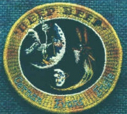 [Journal Contributor Brian Lawrence has supplied a copy of the patch and notes: "The backup crew (Roadrunner) are depicted waiting on the Moon for the prime crew (Wile E. Coyote) to arrive. The Coyote has red fur for Roosa, a pot belly for Mitchell, and a grey beard for Shepard."]