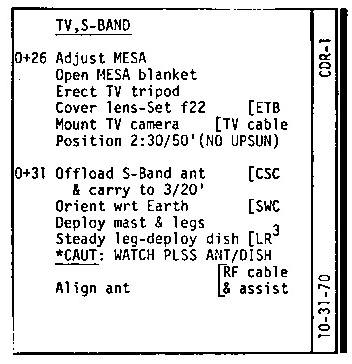 [Rather than take the LEC completely out of its stowage bag and have it turn into a ball of knots as he hands it out to Al, Ed only takes enough of the LEC out of the bag to make his connection in the LM and then hands the bag out to Al who can let the LEC drape down to the ground. At some point, Ed closes the TV circuit breaker, as per checklist.]113:50:36 Shepard: And standing by to deploy the MESA. And the MESA has released. MESA has released properly, Houston.