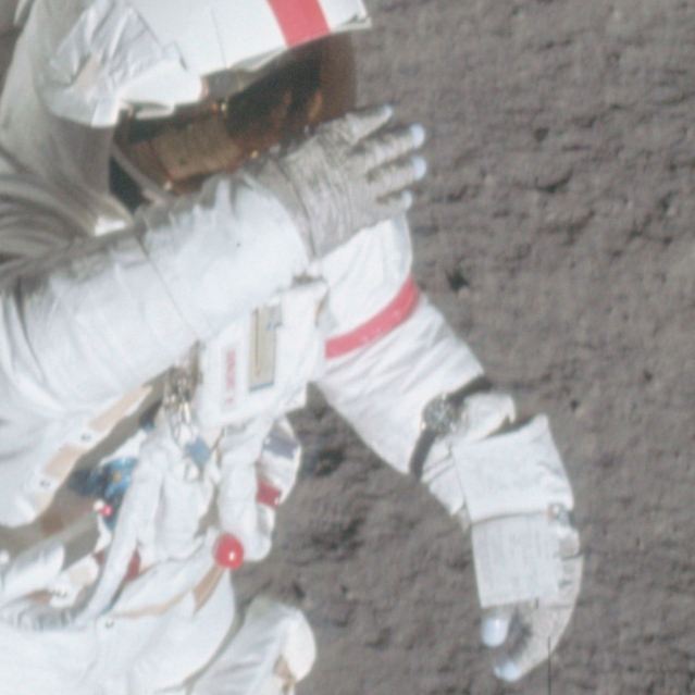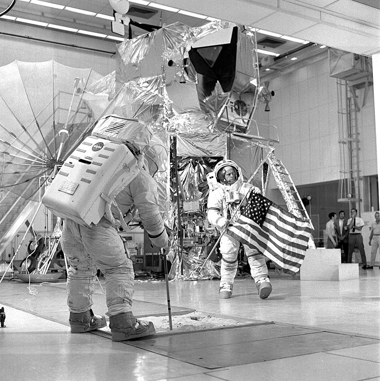 [Ed makes his way over toward the flag. He uses a mixture of skipping steps and doesn't yet have the confident movements he will show later. He does, however, appear to have good control of his center of mass. Astronaut Deke Slayton, the Director of Flight Crew Operations, joins the conversation.]115:01:00 Slayton: Okay. You're looking lovely troops. Why don't you take a pair and let me pass a message to you.