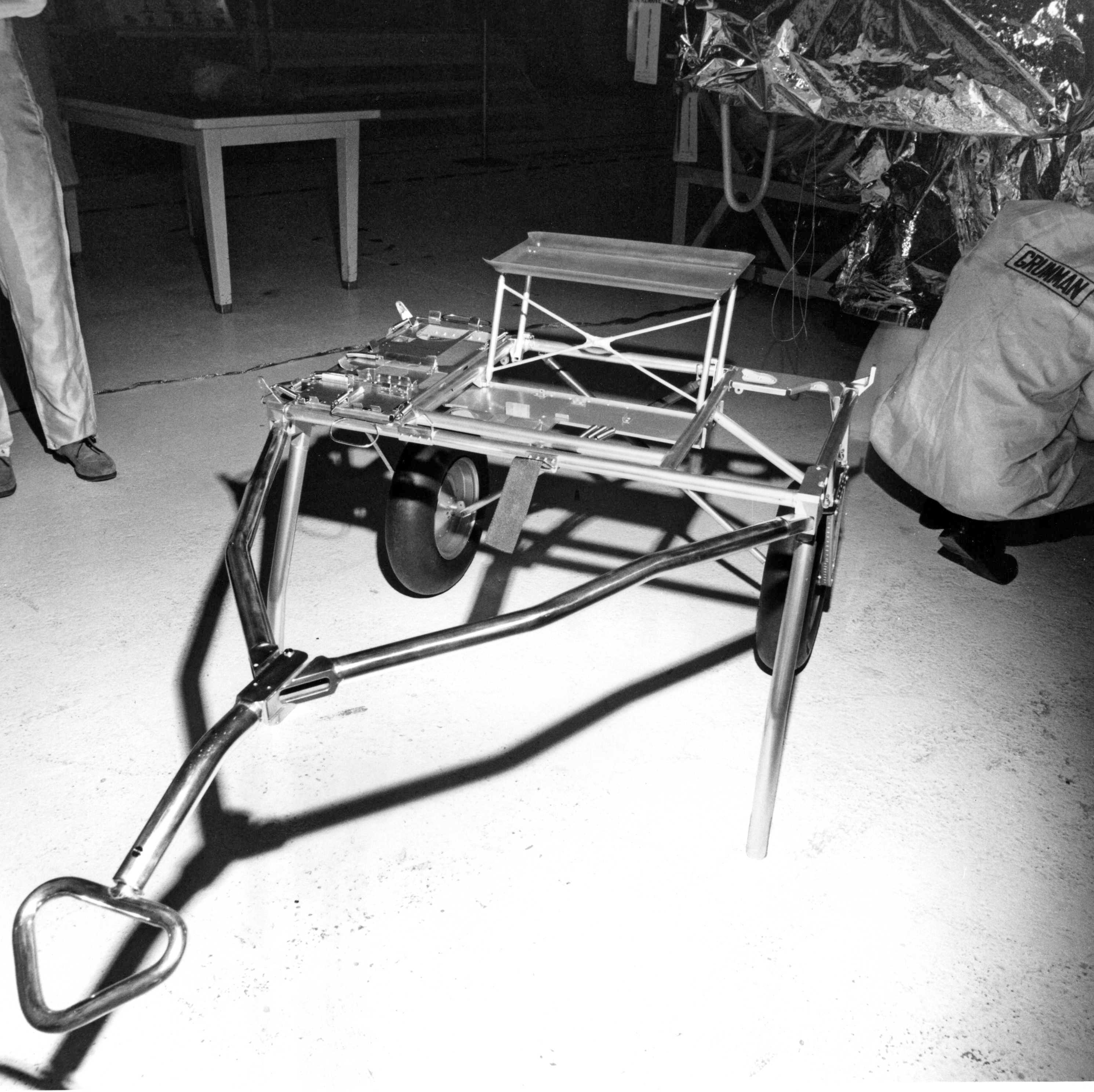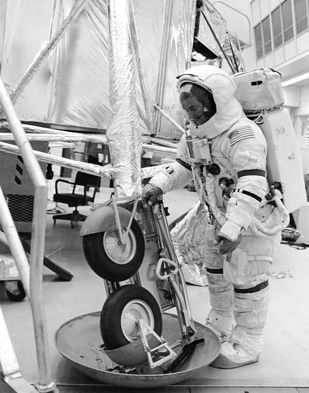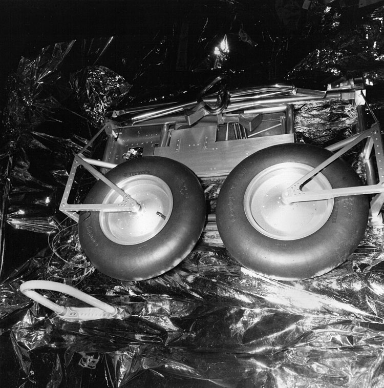 [After unfolding the wheels, they have to lock the front legs and handle into place. NASA photo KSC-70C-165BW shows the MET next to LM-8 at the Cape.]115:03:24 Mitchell: Well, let's see...We've had visitors again.