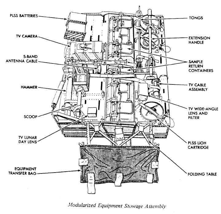 [Mitchell - "Getting your head down with the LEVA on, etc., and trying to get down, that rear step (the so-called midstep which is the eighteen inch transition from the flooring where the astronauts stand to the higher decking that surrounds the ascent engine cover) came right in front of your face. There was barely room for you to get your butt and the bottom of the PLSS out the door. You brushed the LEVA right across the (mid)step. I mean, it was tight."]113:47:10 Mitchell: You'll have to get mine when I come out. Okay. You're clear. Go on out. (Pause)[Jones - "There was some mention of 'don't scratch your visor' on one of the missions."]