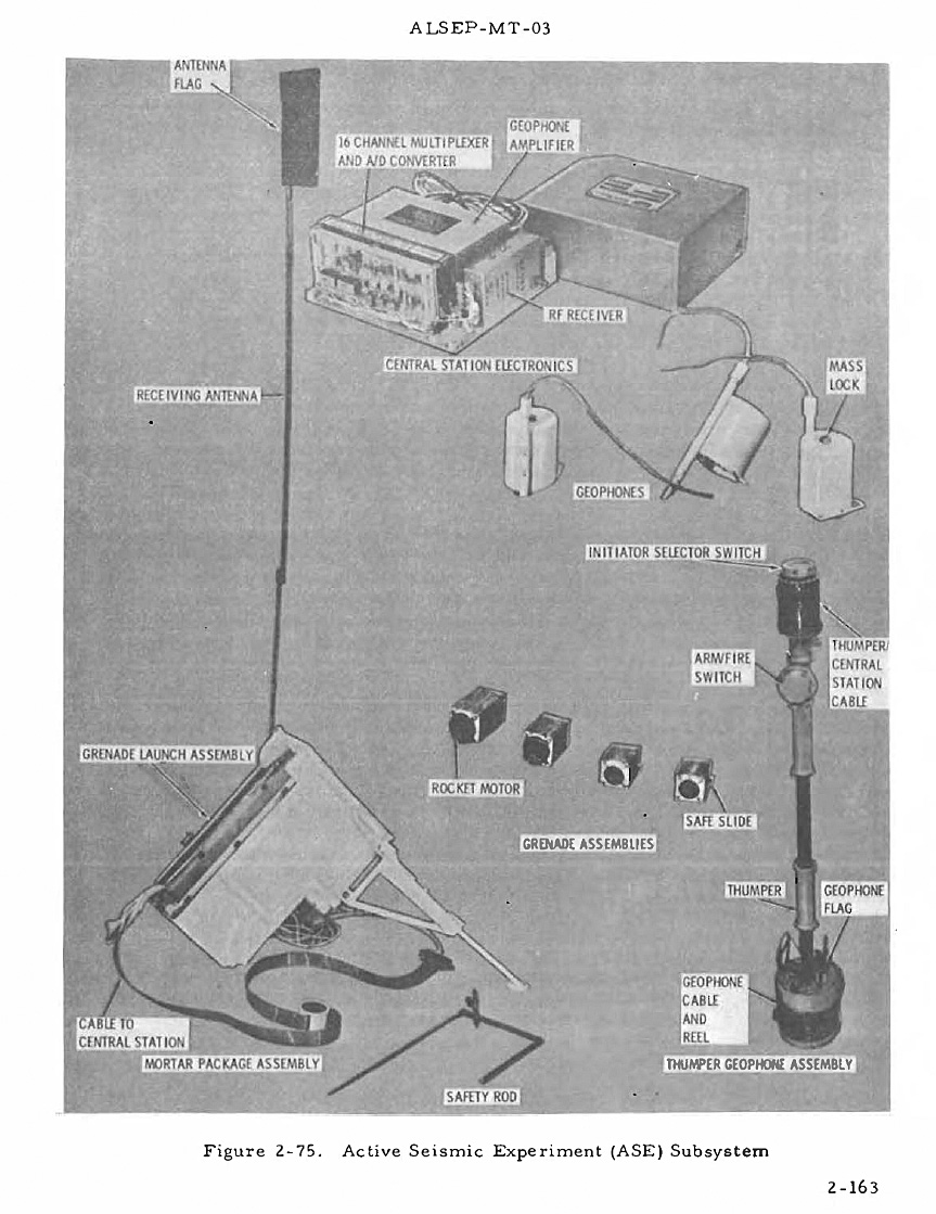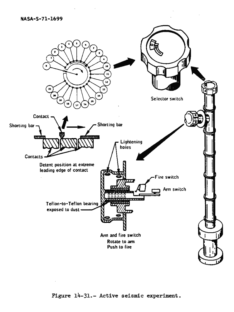 [Ed had 13 successful shots out of 21 possible. There were five misfirings and three that were skipped when Houston asked Ed to move directly to the middle geophone at 117:18:19. The explosive charges in the thumper were Apollo Standard Initiators, which were also used in the explosive bolts that held the LM stages together and in many other applications. Ed started deploying the geophone line at about 116:47:40 and, therefore, has devoted about 48 minutes to the experiment. Because the data it provided gave critical insights into the thickness of the regolith and the deeper layers, the thumper geophone was reflown on Apollo 16 and, on Apollo 17, was replaced with an experiment in which the crew deployed larger charges as they drove along on their geology traverses. In general, these active seismic experiments and the related Traverse Gravimeter experiment flown on Apollo 17 gave a large return for a modest investment of time.][The Apollo 14 Mission Report contains the following discussion of the thumper misfires: "The most likely causes of the problem are associated with the detent portion of the selector switch and dirt on the firing switch actuator bearing surface. The selector switch dial can re-position out of detent in the course of normal handling because of the lack of positive seating in the detent for each initiator position. For an initiator to be fired, the selector switch must provide (electrical ) contact to the proper unfired initiator position. Examination of the qualification unit has shown that the detent is positioned at the leading edge of the contact surface so that any movement toward the previous position will break the contact. Also, the lightening holes in the firing switch knob made it possible for dirt to get onto the Teflon bearing surfaces, temporarily increasing the force required to close the switch. Corrective action for Apollo 16 consists of adding a positive detent mechanism, properly aligned with the selector switch contacts, and dust protection for the firing switch actuator assembly." Evidently, these fixes did the job because all 19 of the Apollo 16 charges fired properly.]