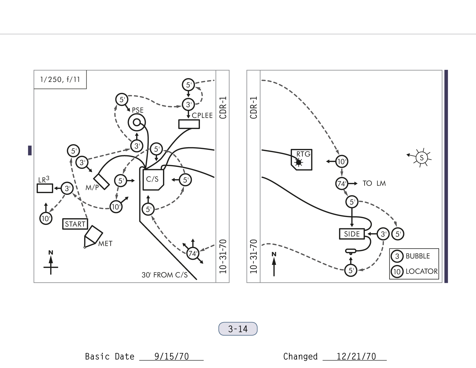 [Al goes toward the MET to take three additional photos at 74-foot focus - one north, one southeast, and one northwest - as indicated by the circled "74'" with three emerging arrows in the photo plan.]117:23:24 Mitchell: 5, 4, 3, 2, 1, Fire. Good shot.