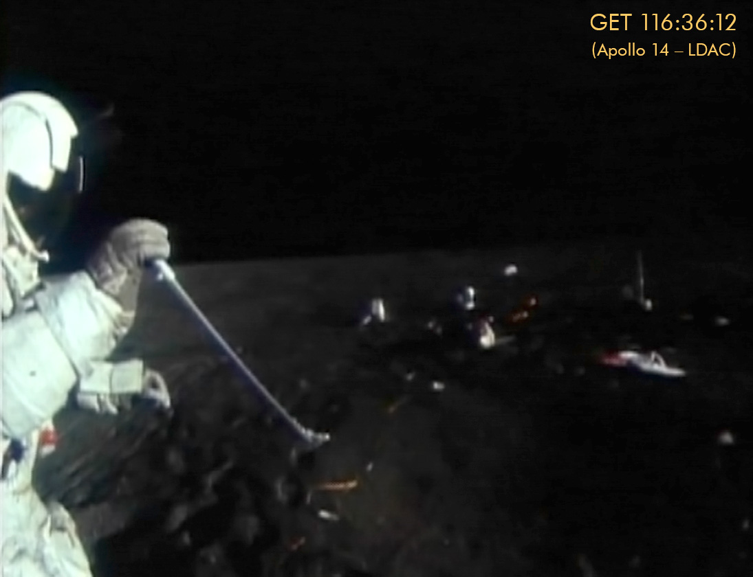 [Mitchell - "You had to get the tool down in there and, as I recall, it was a twist to release it and, apparently, that was packed full of dirt. Now, Al was looking at it, trying to see it. And he couldn't get the tool in and couldn't get it released - and couldn't see it. Remember that, on the lunar surface, there's no air to refract the light in there. So, it's either shadow or it's light and, unless you've got a direct sunlight on it, there's no way in hell you can see anything. That's an amazing phenomenon on an airless planet. It's amazing how much we count on reflected and refracted light here. But there, unless you had it directly in sunlight, it was just pitch black. And you couldn't see a damn thing. And that's what he was wrestling with, there. The dirt was packed in around it and, besides that, he couldn't see down in there, unless we picked it up, physically, and twisted it and held it so we could get it in the sunlight. He couldn't see what he was doing."]