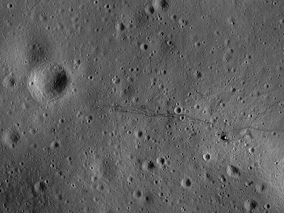 [After they finish the ALSEP deployment, Al will take AS14-67- 9367, which shows the MET tracks leading back to the LM.]116:03:48 Shepard: (Positioning the MET 20 to 30 feet south of the barbell) Can't get any closer without putting it in that crater, Ed.
