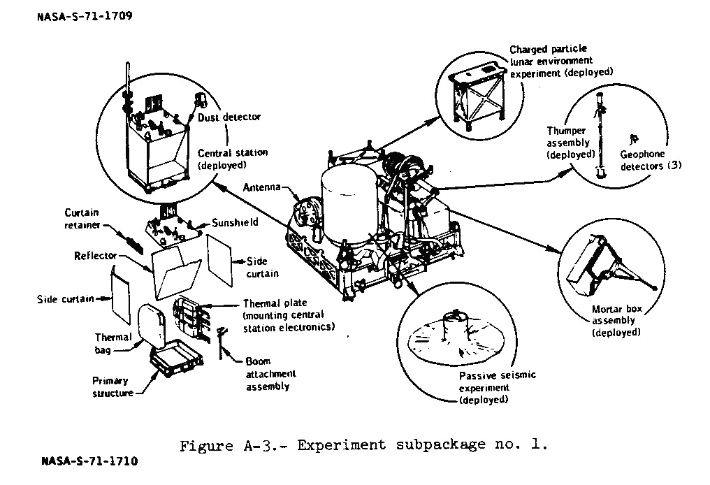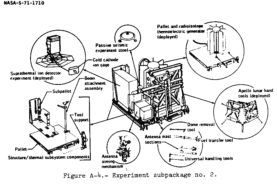 [The subpallet holds the SIDE (Suprathermal Ion Detector Experiment), CCIG (Cold-Cathode Ion Gauge), PSE stool, and the Antenna Aiming Mechanism.]116:05:48 Mitchell: Houston, the RTG (Radioisotope Thermoelectric Generator) cable temperature is 175 degrees.