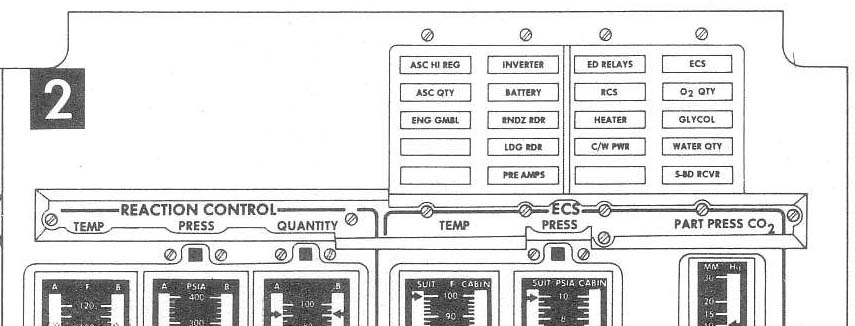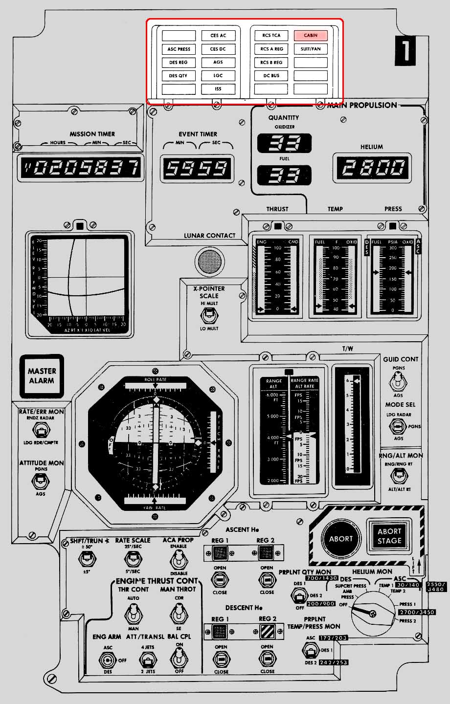 [The Cabin warning light is one of fourteen warning lights at the top of Panel 1. As warning lights, they are all Aircraft Red when they are on. There is an array of caution lights at the top of Panel 2. All are Aircraft Yellow when illuminated.]135:43:24 Mitchell: Okay. We're at 5 pounds.