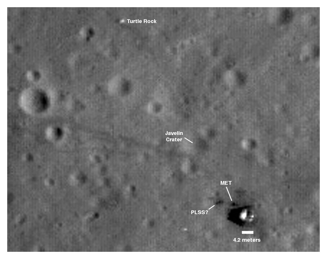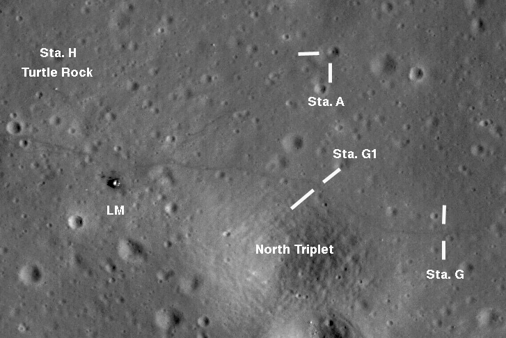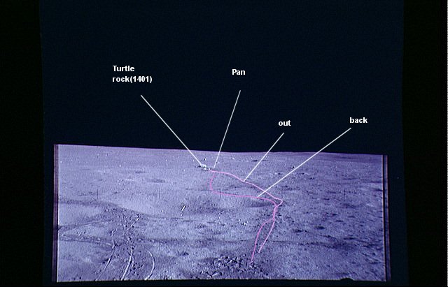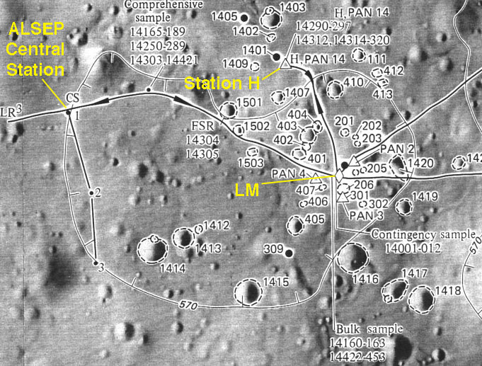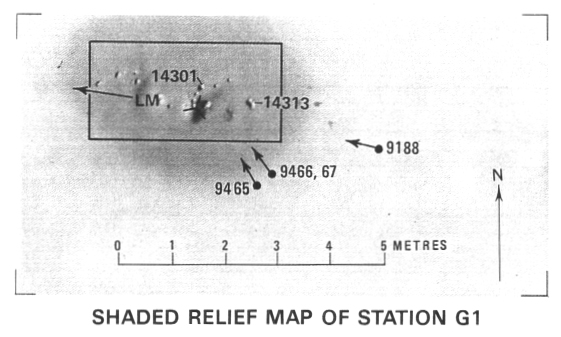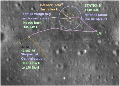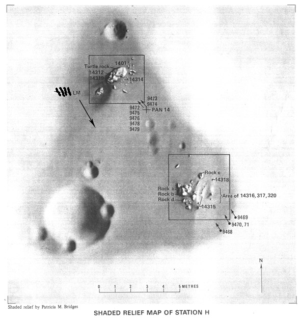 [Ed's Station H activities are summarized in the shaded relief map. Note that the direction to the LM is mislabeled in the original version. The prominent boulder now known as Turtle Rock is labelled '1401' in both the shaded relief map and the USGS map. See, also, a detail from LROC image M168319885. The locations marked on the shaded relief map showing where Ed took Hasselblad images indicate that he began by photographing and examining the boulders about 9 meters southeast of Turtle Rock. His run out to this location took about 63 seconds - 134:55:32 to 134:56:35 - and covered about 65 meters. His average speed was 3.7 km/hr.]134:57:20 Shepard: Okay, the center (means "Central Station") alignment on the ALSEP has changed very little. There'll be a slight change in the bubble level. Stand by.[Mitchell - "That's what you call a real-time crew decision. Short on time, get as many as you can, best documentation you can, and hope you can sort it out at the end when it was all over with."]