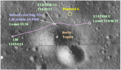 [Al and Ed have just left Station G and will do a quick sample at the rim of North Triplet on their way back to the LM. See the USGS map on which the site of the rim sample is labeled 'G1'. See, also, the segment diagram and a detail ( 0.3 Mb ) from the November 2009 LROC image.]MP3 Audio Clip (Glover) (41 min 14 sec)