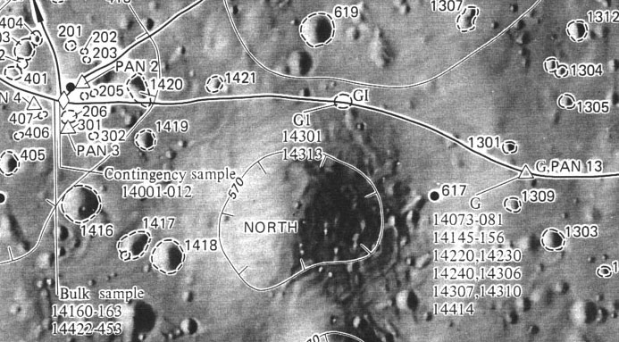 [Ed's cross-Sun "before" stereopair is AS14-68-9465 and 9466, while Al's down-Sun "locator" is AS14-64- 9188.]134:50:02 Haise: Okay, Ed and Al, as soon as you wrap this one up, you're going to have to press on back to the LM, or we're going to be really tight on the closeout.