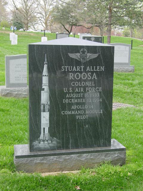 Chosen with the fifth group of astronauts in 1966. Was the command module pilot of Apollo 14, and backup command module pilot for Apollo 16 and Apollo 17. Retired from the Air Force with the rank of Colonel. Resigned from NASA on February 1, 1976 to become Vice President for International Affairs, U.S. Industries Middle East Development Company, based in Athens, Greece. Returned to the United States in 1977 to become President of Jet Industries in Austin, Texas. Later worked in private business in Austin and was owner and President, Gulf Coast Coors, Inc., Gulfport, Mississippi. Stu Roosa died on December 12, 1994 of complications from pancreatitis. He is buried at Arlington National Cemetary ( 235k ). Photo courtesy Russell C. Jacobs, March 2006.
