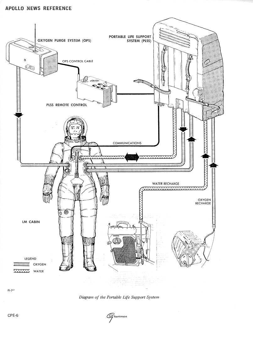 [They are making sure that the cooling control on the PLSS is set to minimum. This control is on the bottom of the PLSS at the front right corner. They won't actually turn the cooling on until they have the hatch open. The water sublimator that is at the heart of the cooling system won't function except in a vacuum.]113:34:04 Mitchell: Turn your pump on; that's to the right.