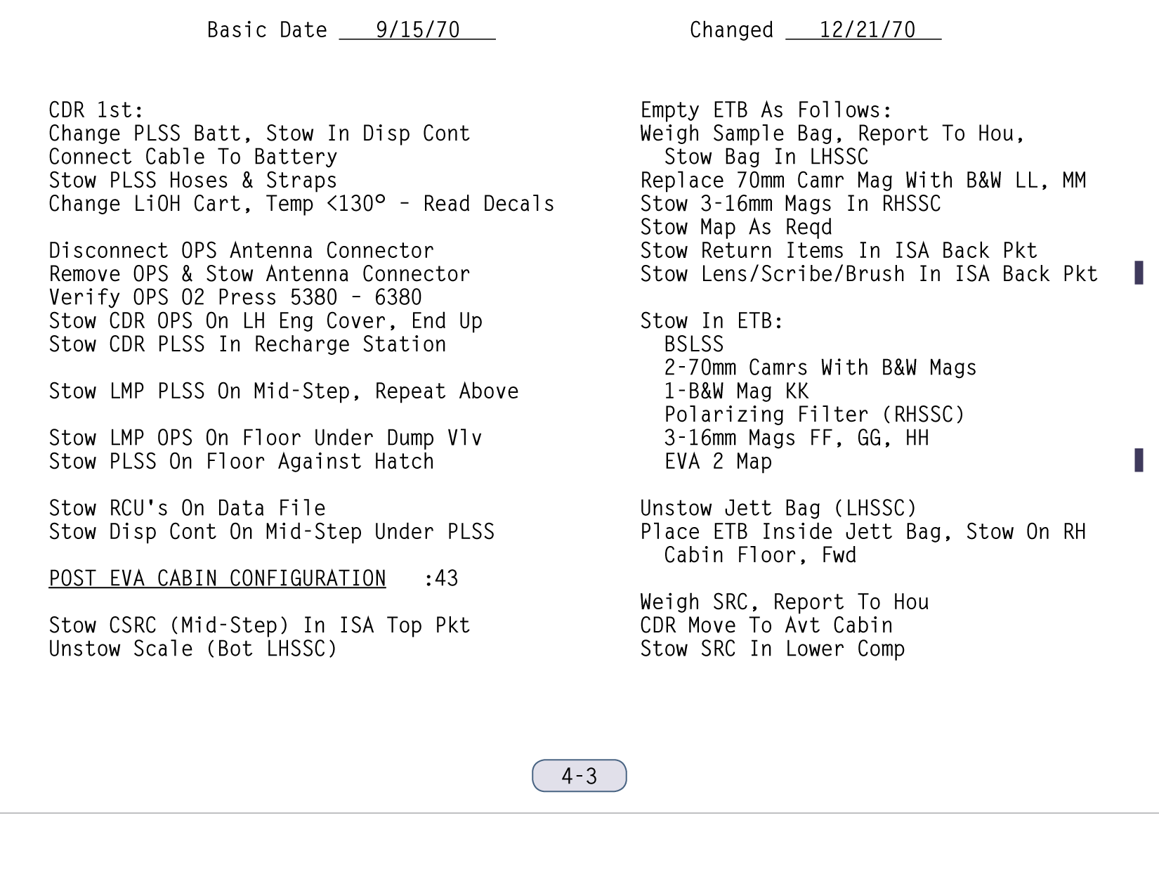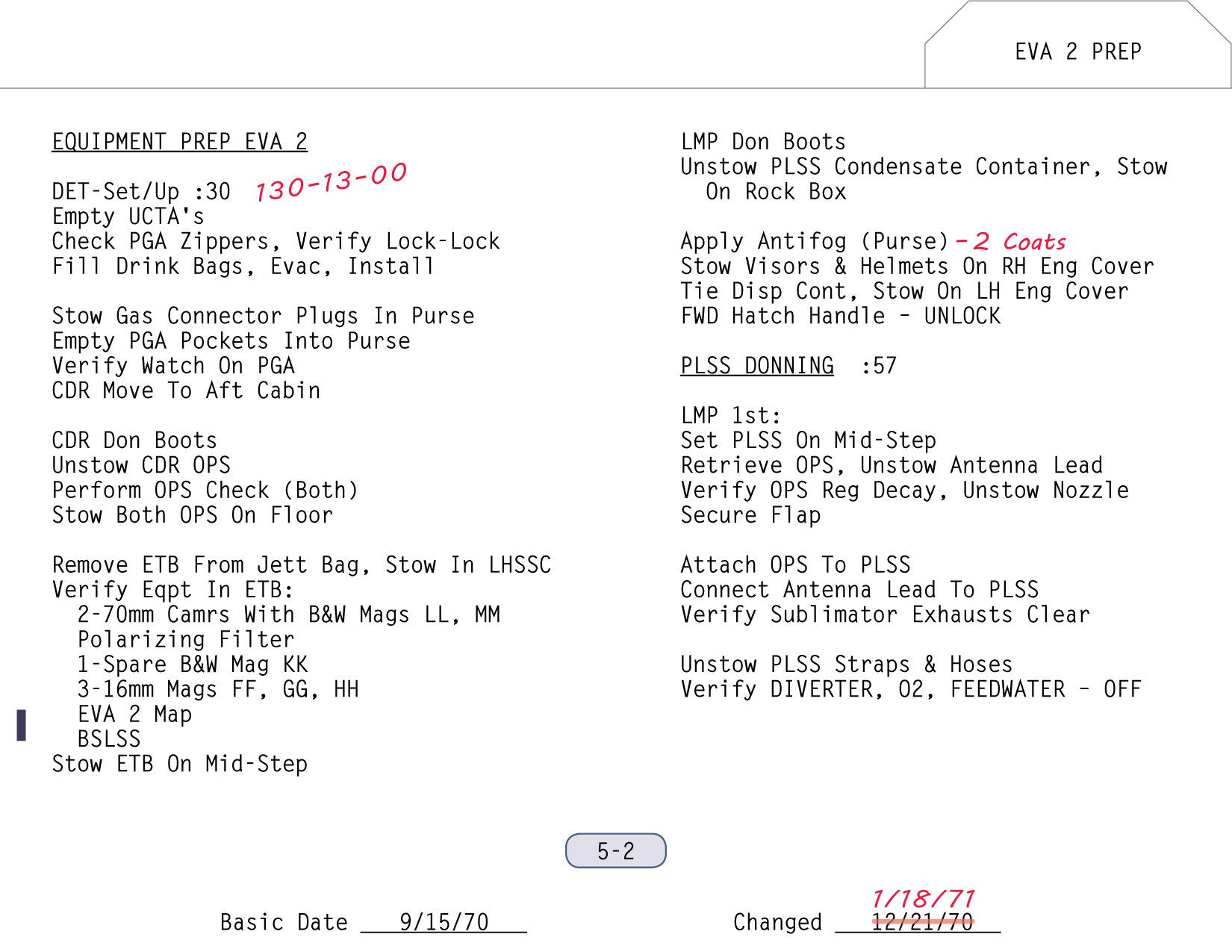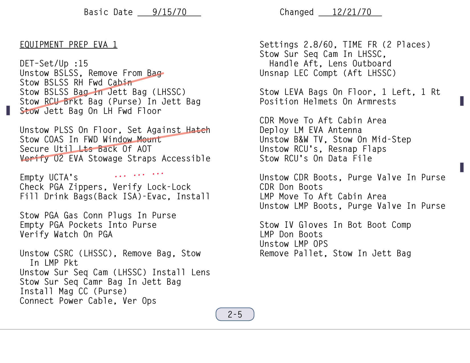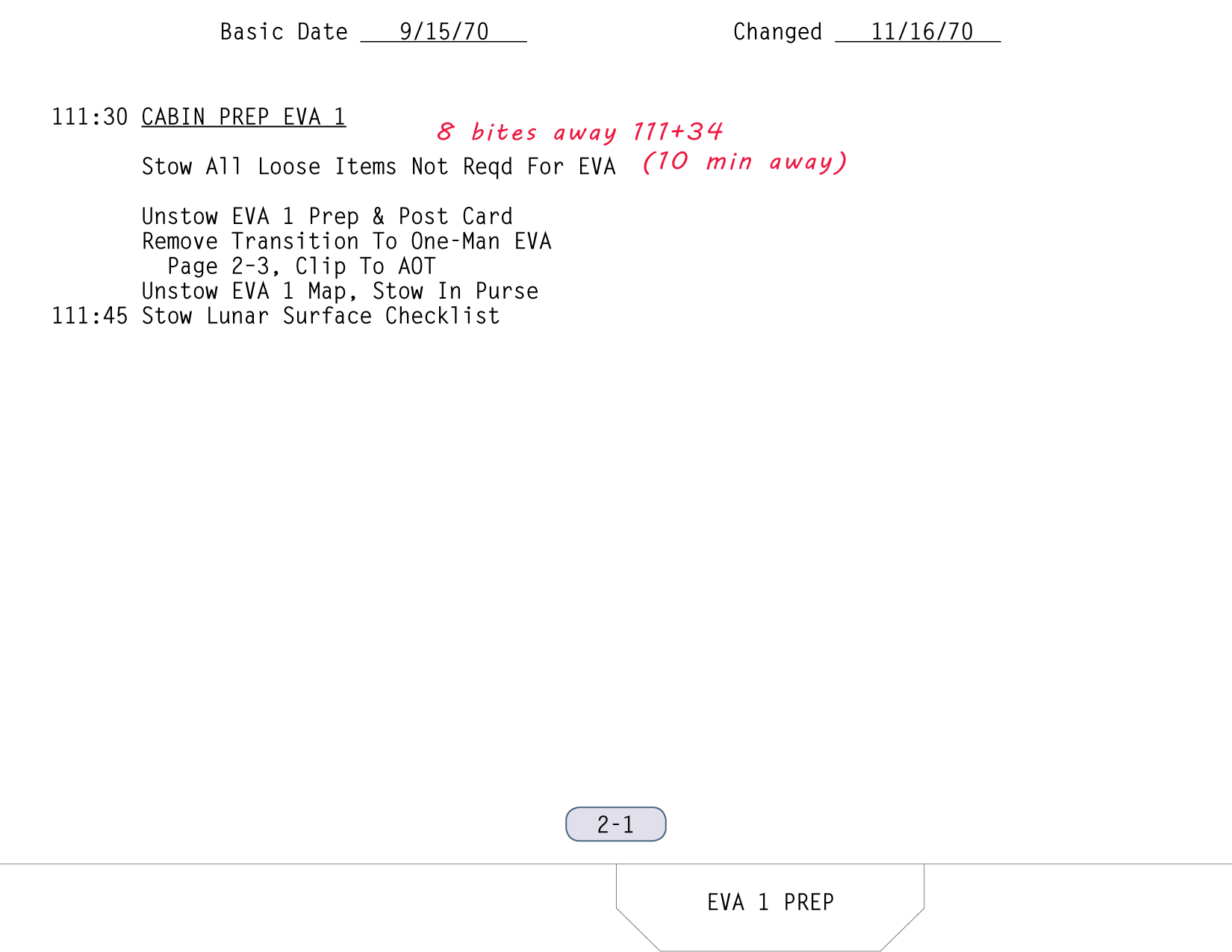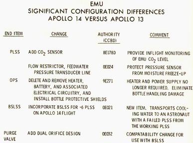 [Mitchell - "The powering down, putting the computer in standby, and IMU/Operate circuit breaker to open was part of the lunar surface checklist. Then you went right from there into the EVA-1 Prep. Now, it wasn't time critical up to that point, but once you started EVA Prep, we needed a pretty close handle on time. And my recollection - my guess is - is that they're simply setting their timer to a benchmark on the EVA Prep checklist which corresponded to 15 minutes."]111:10:45 McCandless: Antares, this is Houston. If you feel like giving us a running commentary as you go through the Equipment Prep for EVA-1, we'll be checking you off here.[They are on page 2-5 of the LM surface checklist and the first step involves starting the Digital Event Timer (DET) to 15 minutes and letting it count up. During this first part of the EVA-1 Prep, they will get out all the equipment they will need, and get it ready and in place so that, once they start donning their backpacks and can no longer move freely, everything will be within reach. The BSLSS, which is mentioned first in this part of the checklist, is the Buddy Secondary Life-Support System, a set of hoses that would allow them to share cooling water in the event that one of the backpacks - the Portable Life Support Systems or PLSSs - fails. the BSLSS is new to Apollo 14, as indicated in a table of EMU configuration differences between Apollo 14 and Apollo 13. Scan by Ulli Lotzmann.]