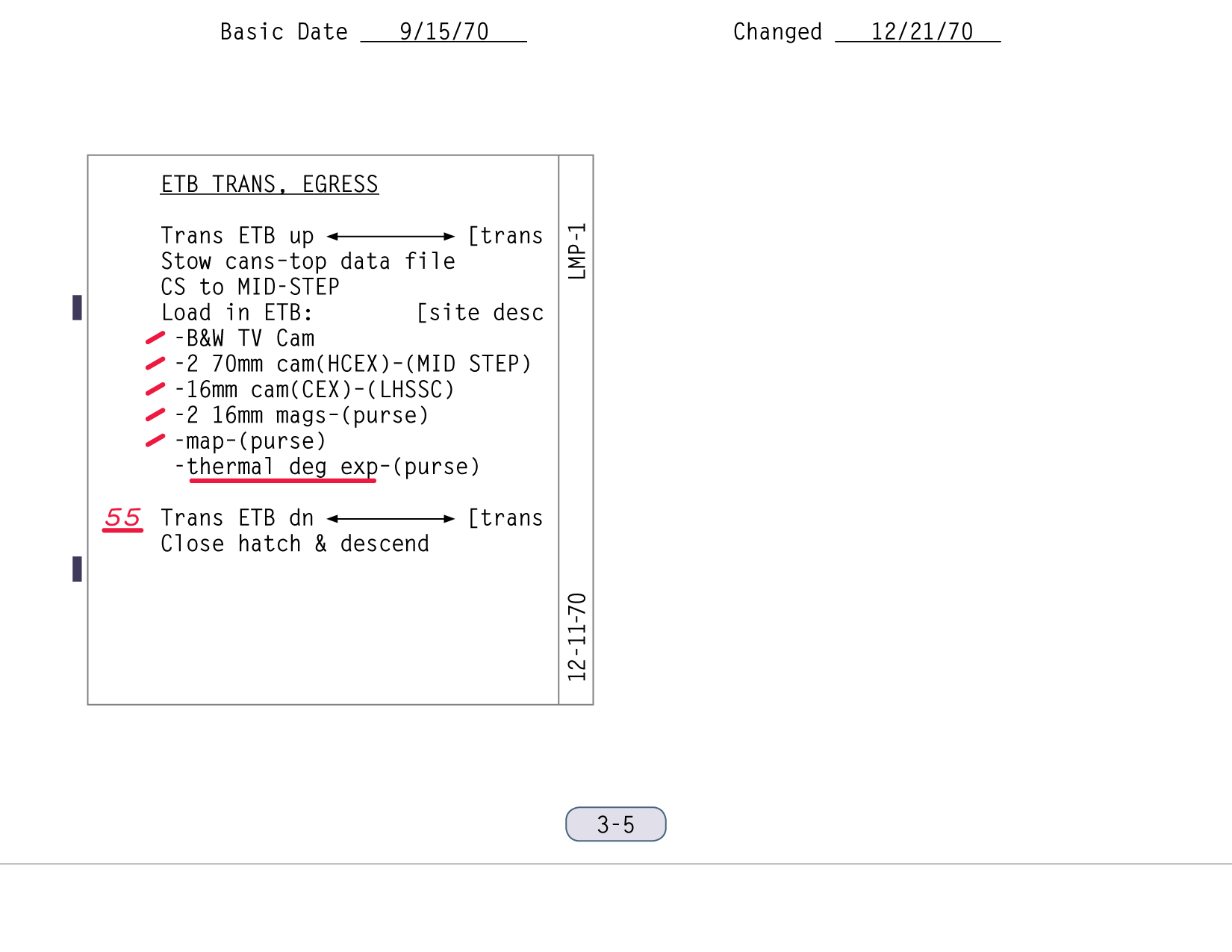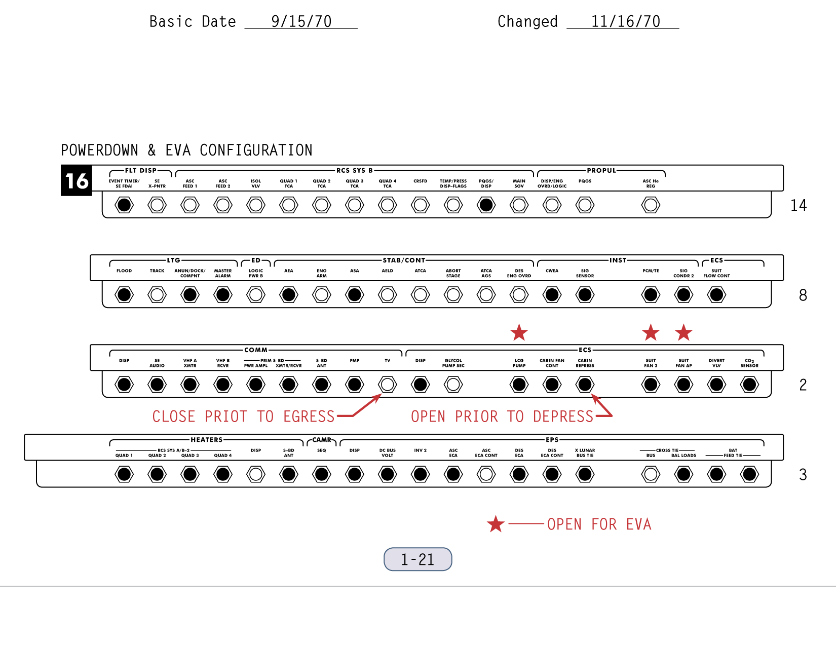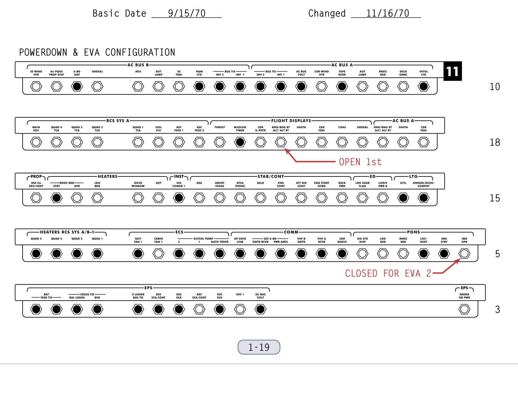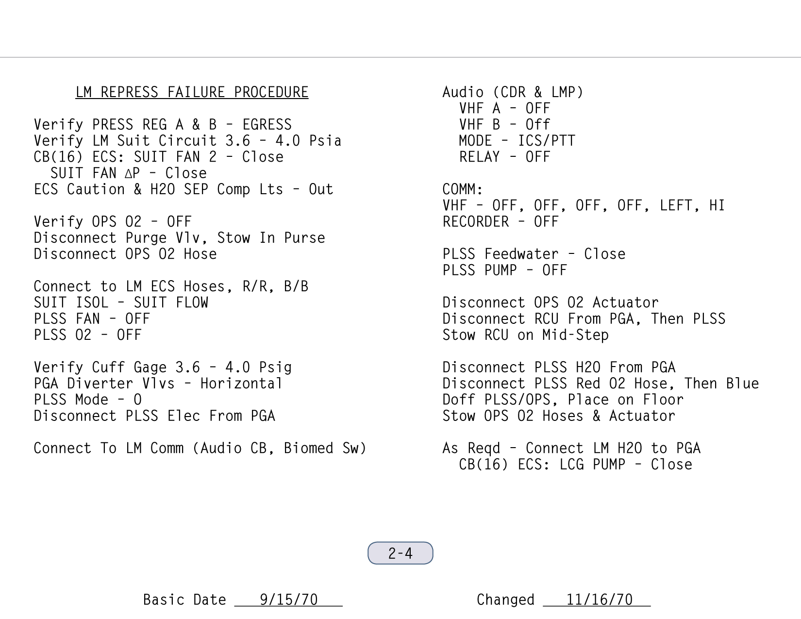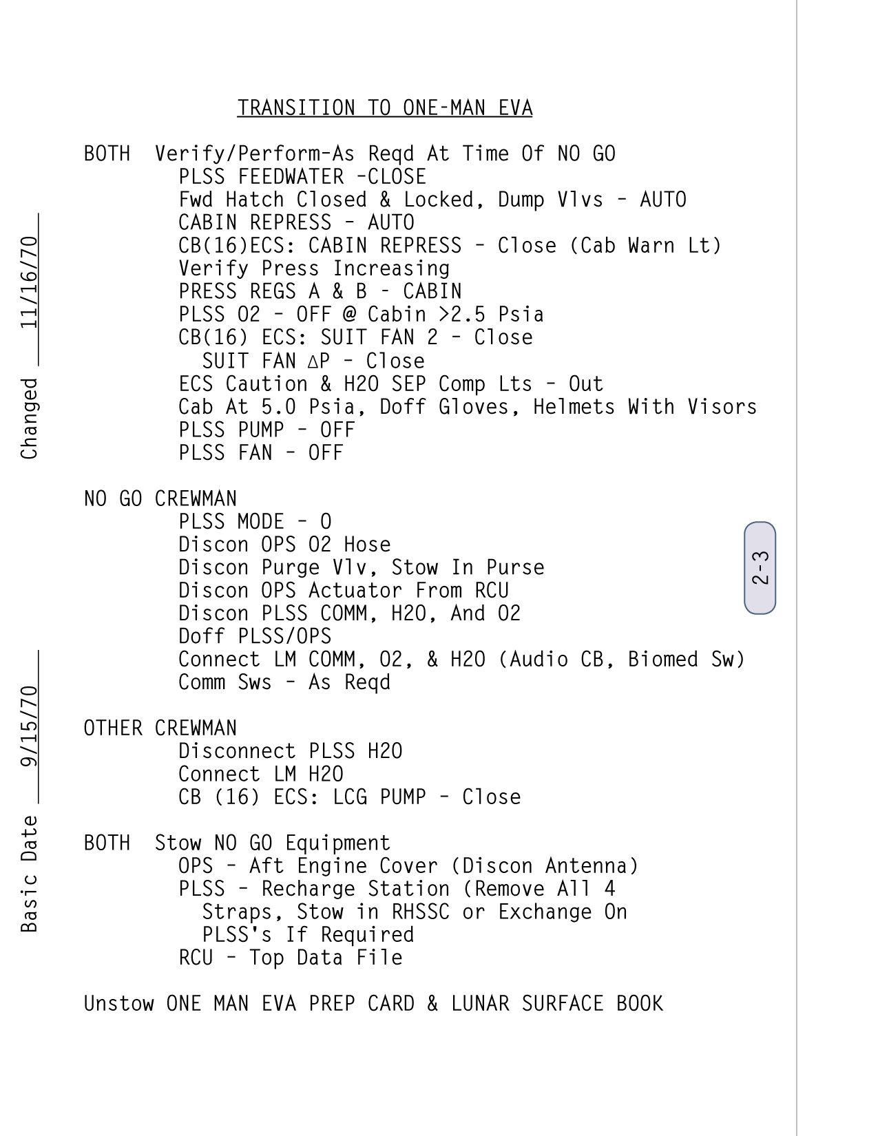 [Mitchell - "The powering down, putting the computer in standby, and IMU/Operate circuit breaker to open was part of the lunar surface checklist. Then you went right from there into the EVA-1 Prep. Now, it wasn't time critical up to that point, but once you started EVA Prep, we needed a pretty close handle on time. And my recollection - my guess is - is that they're simply setting their timer to a benchmark on the EVA Prep checklist which corresponded to 15 minutes."]111:10:45 McCandless: Antares, this is Houston. If you feel like giving us a running commentary as you go through the Equipment Prep for EVA-1, we'll be checking you off here.[They are on page 2-5 of the LM surface checklist and the first step involves starting the Digital Event Timer (DET) to 15 minutes and letting it count up. During this first part of the EVA-1 Prep, they will get out all the equipment they will need, and get it ready and in place so that, once they start donning their backpacks and can no longer move freely, everything will be within reach. The BSLSS, which is mentioned first in this part of the checklist, is the Buddy Secondary Life-Support System, a set of hoses that would allow them to share cooling water in the event that one of the backpacks - the Portable Life Support Systems or PLSSs - fails. the BSLSS is new to Apollo 14, as indicated in a table of EMU configuration differences between Apollo 14 and Apollo 13. Scan by Ulli Lotzmann.]