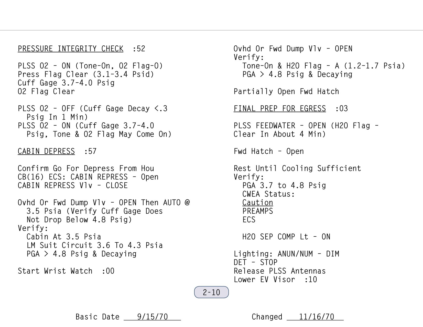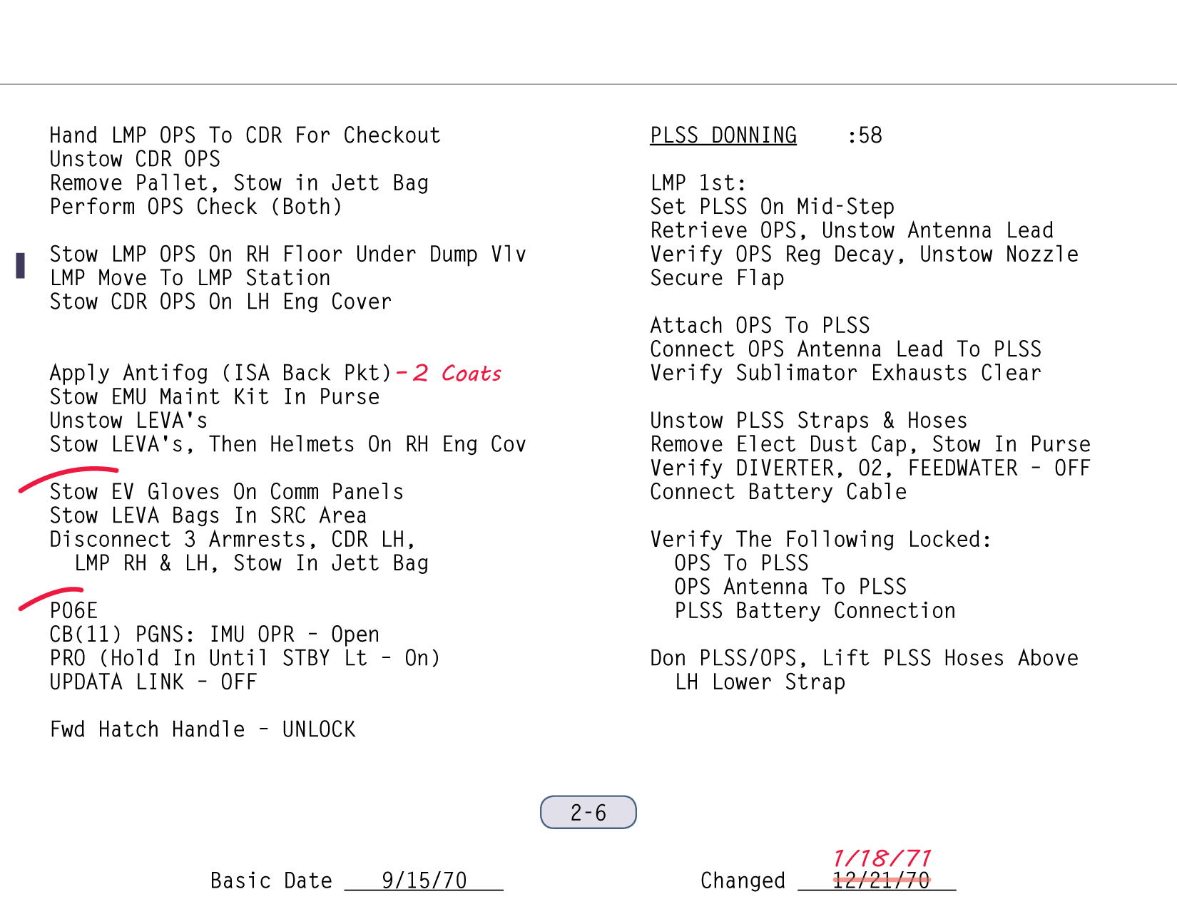 [After going into Program 06, near the bottom of the left-hand column of Sur 2-6, they skip the steps relating to the IMU, having done them earlier at Houston's request. According to the checklist, the Digital Event Timer should now read 58 minutes. They set it to 15 minutes at about 111:08 and, should have reached :58 on the DET 43 minutes later, at 111:51. Because of Al's urine transfer problem, they are 11 minutes behind schedule, a very modest amount.]112:06:48 Mitchell: Okay, Houston. We're at that point where we hand the real PLSS out and get the lightweight one.[It is much easier to unlock the hatch now, before they don their gloves, than later. The hatch area is great enough that there is no possibility of the hatch coming open until they open the dump valve and bleed the cabin pressure down to under 0.2 psi from the current 5 psi.]