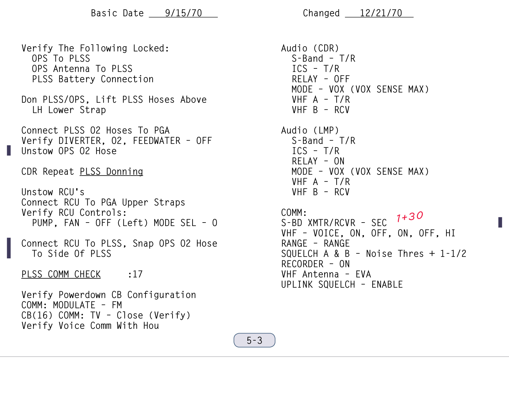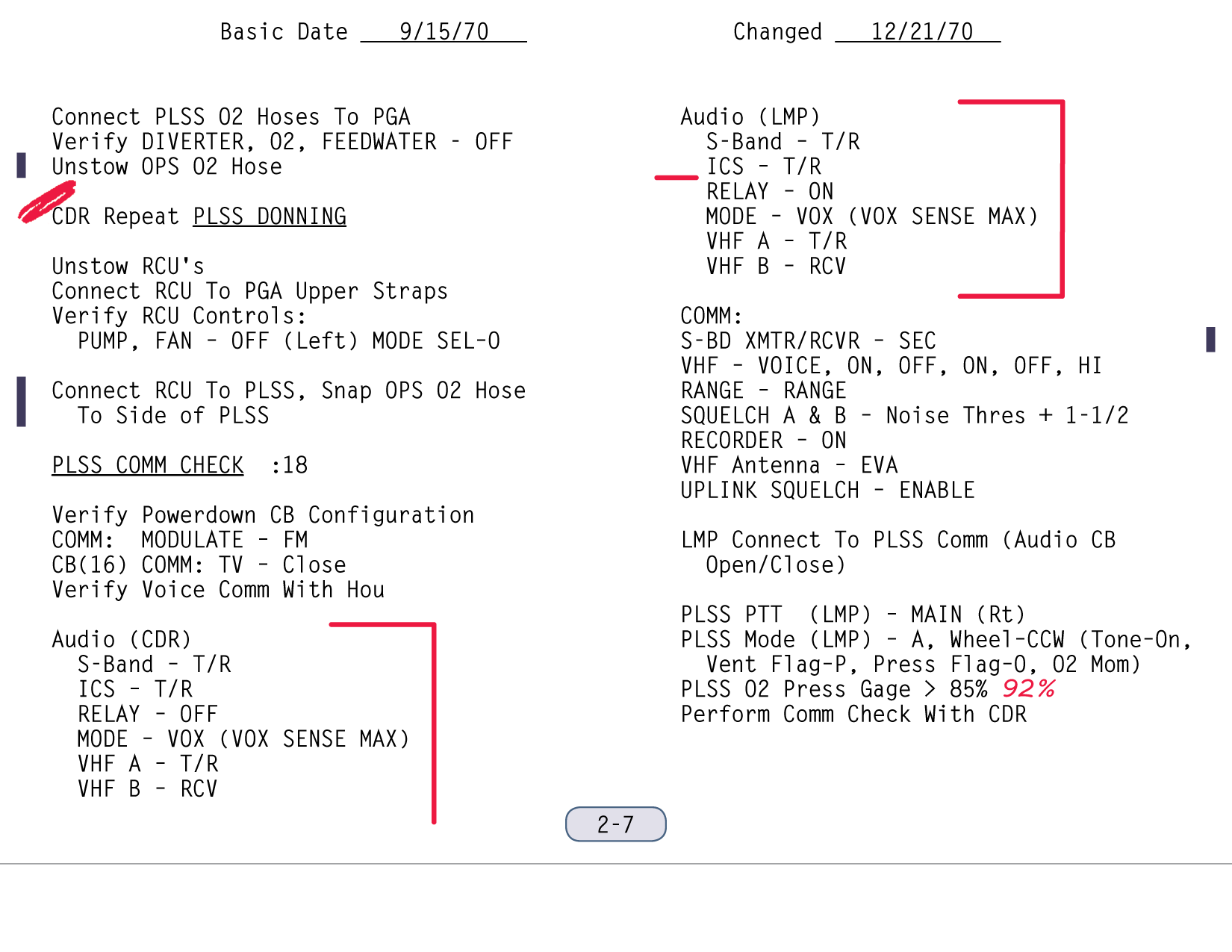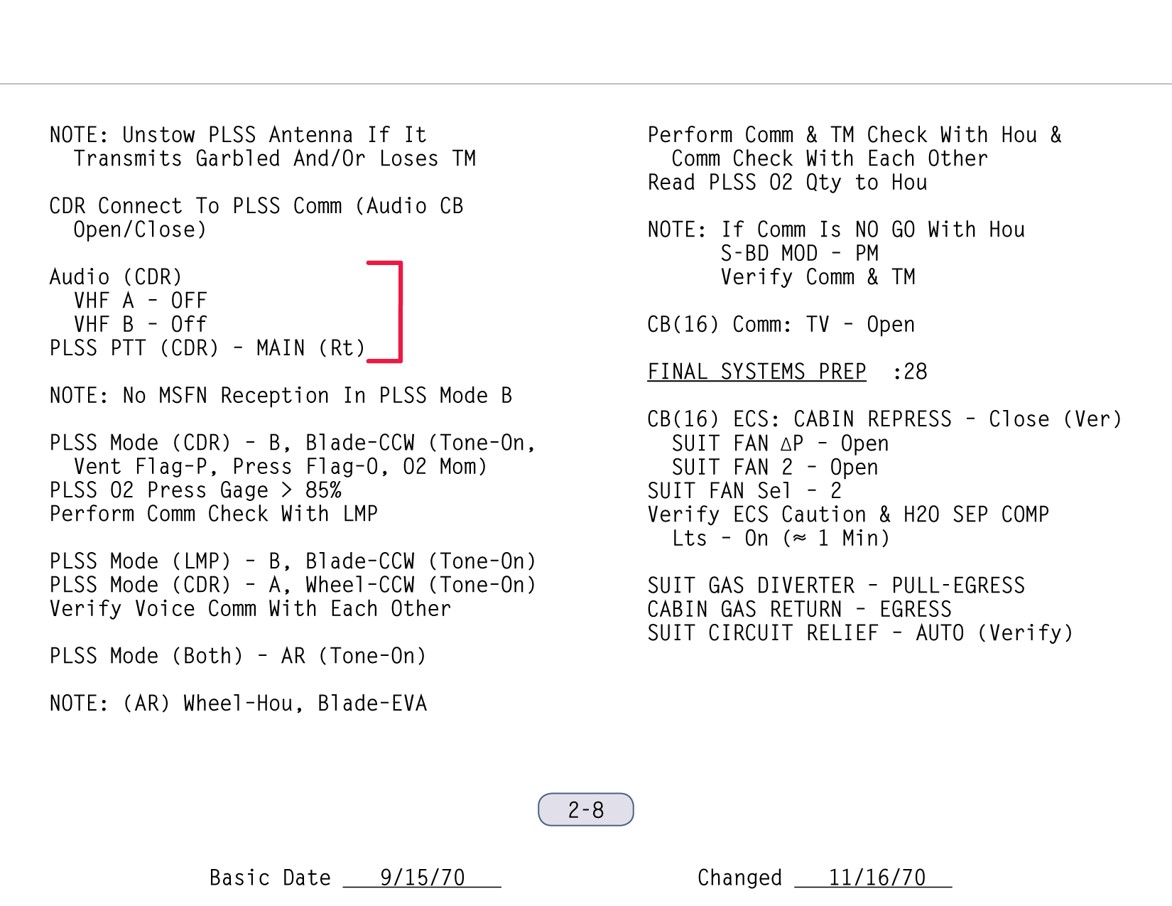 [The steps that Shepard discusses in his next transmission are in the second paragraph of the right-hand column on page 2-7.]112:26:56 Shepard: Okay. On the comm panel S-Band tran...(Pause while he finds his place in the checklist) VHF panel: Voice, On, Off, On, Off, Hi; Voice, On, Off; On, Off, Hi. Okay, Range to Range. Squelch A and B noise threshold plus 1 and a half; (Tape) recorder, On. (Pause)