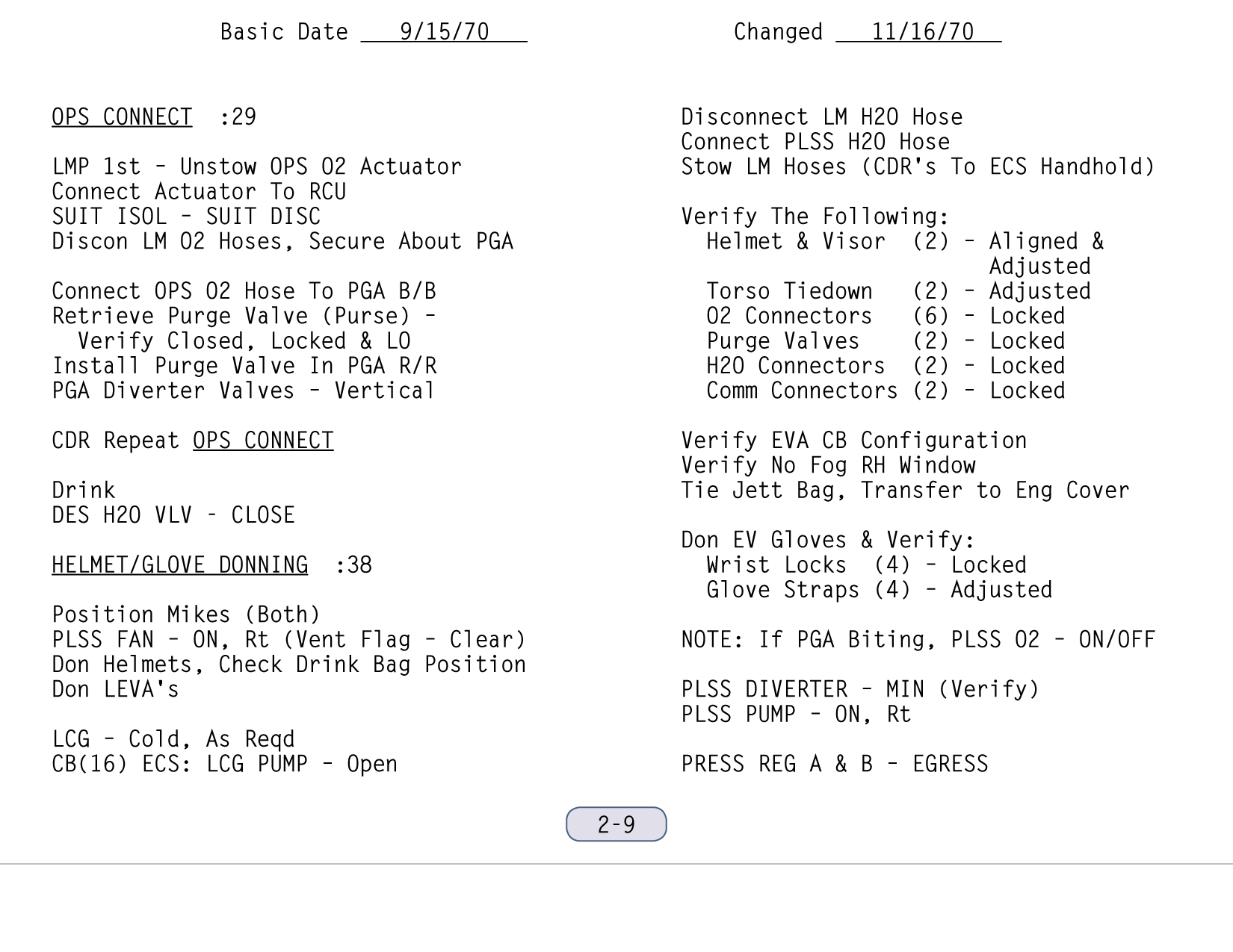 [Long Comm Break]111:33:16 Mitchell: Okay, Houston. We're down to "verify watch on PGA". Proceeding on.[In the checklist, PGA is the Pressure Garment Assembly, the suit. Lock-locks are locks on locks. The wrist rings, for example, are locked into position by rotating a collar into the locked position and it, in turn, is locked by a pair of catches. The drink bags are worn inside the neckrings of the suits and, using a short tube-like valve, the astronauts can get drinks from the bags whenever they need them. The Apollo 14 crew is the first to have drink bags.]