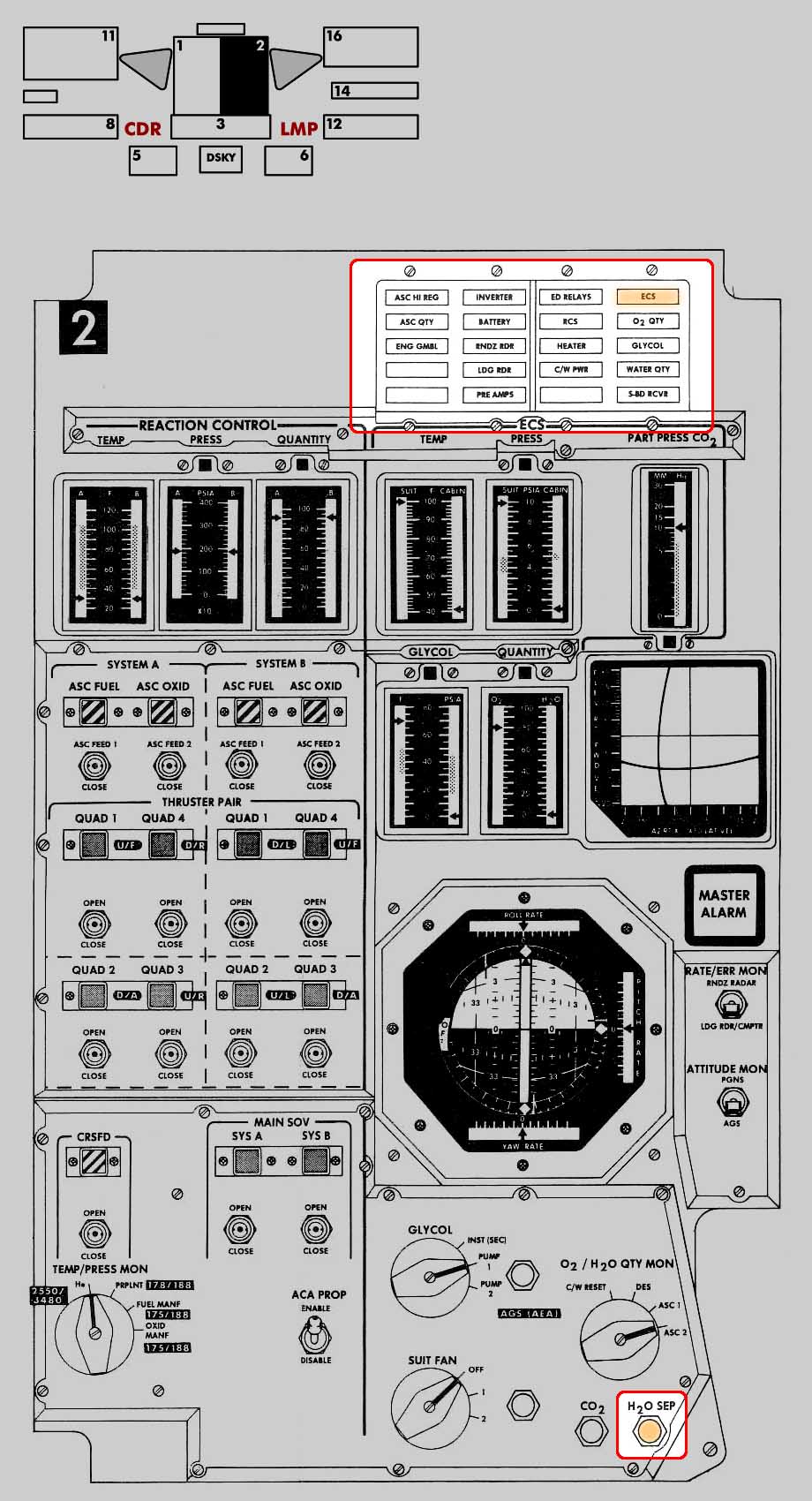 [Mitchell - "The sublimator didn't have to be completely refilled. It hadn't totally evacuated from the first EVA."]131:11:30 Mitchell: Okay. I've got PREAMPS and an ECS light. Water Sep Component light is On. Take the lighting to the Annunciator/Numerics Dim position. And I'll stop the DET (Digital Event Timer). (Pause)[Jones - "So, it started out dry prior to the first EVA and had to fill up all the tubes with water."]