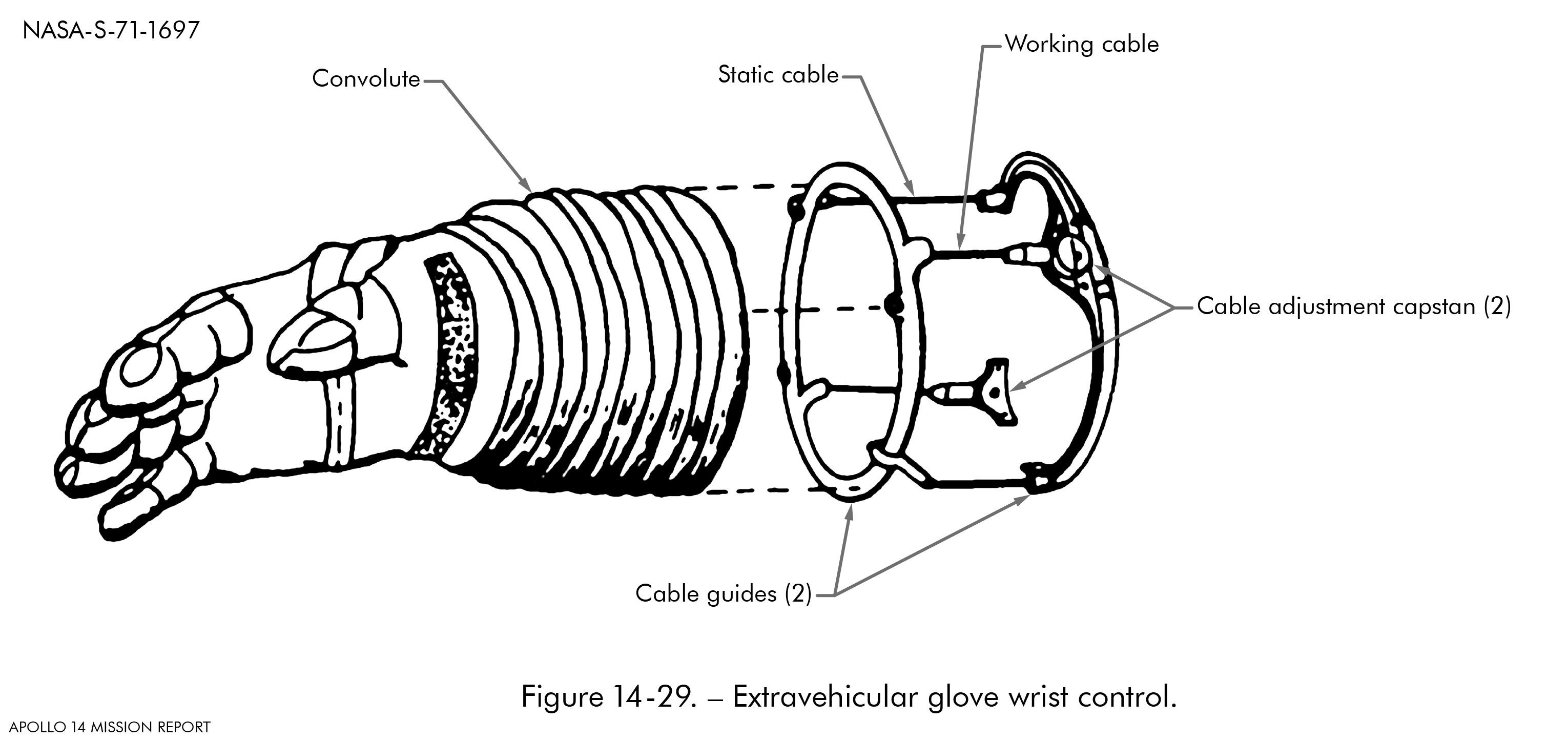 [The following is taken from the Apollo 14 Mission Report. "After suit pressurization for the second EVA, the Lunar Module Pilot reported that his right glove had pulled his hand to the left and down and that he had not had this trouble during the first EVA...Initial indications from the Lunar Module Pilot were that a cable had broken in the glove (Fig 14_29). A detailed examination of the returned glove, together with (vacuum) chamber tests, have shown that there are no broken cables and that there is free operation of the glove wrist-control cable system. However, with the Lunar Module Pilot in the pressurized flight suit, the glove took the position which was reported during the mission. The wrist-control assembly provides a free-moving structural interface between the glove and the wrist disconnect so as to assure convolute action for wrist movement in the pressurized state. The design inherently allows the glove to take various neutral positions. This anomaly is closed."]