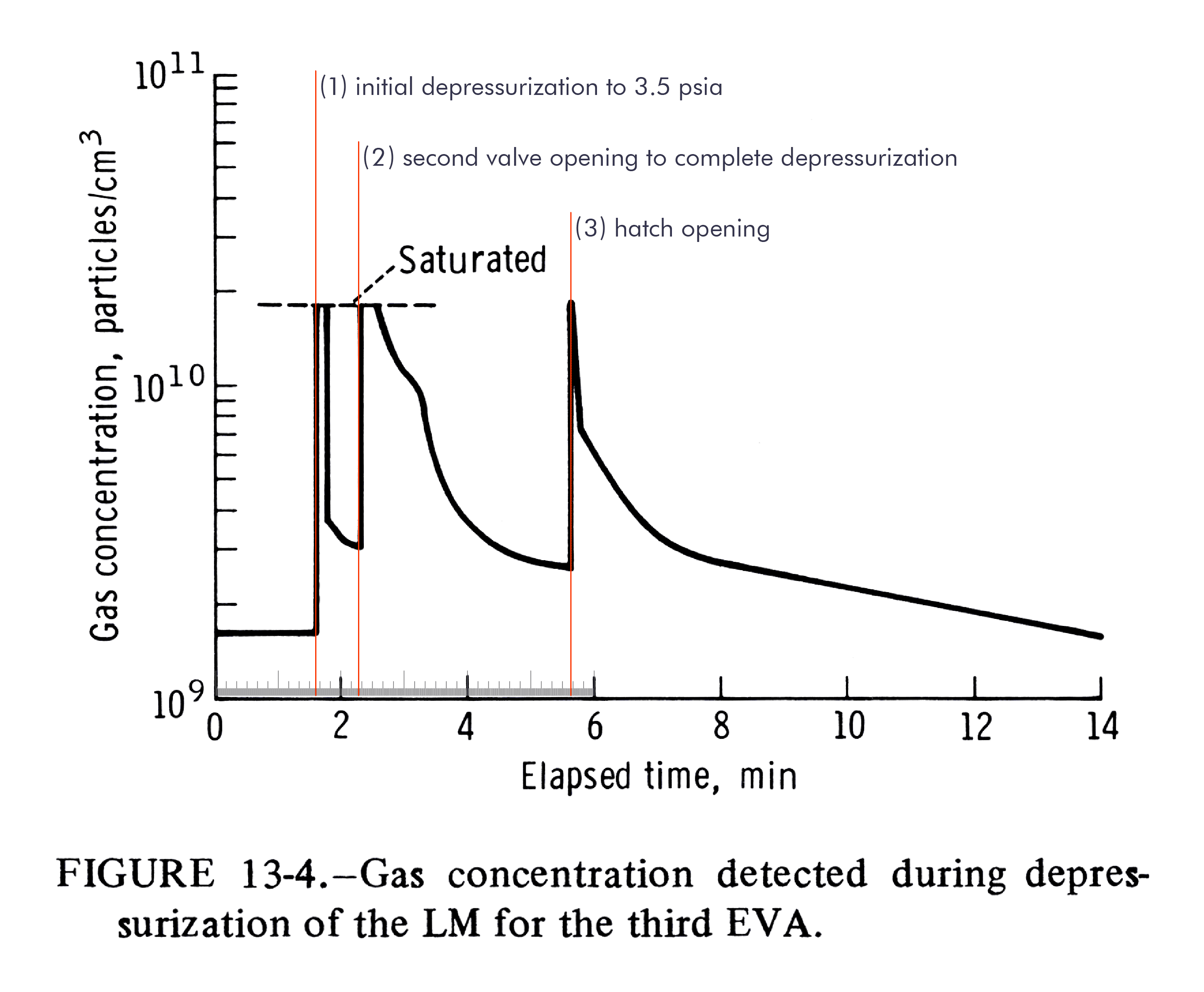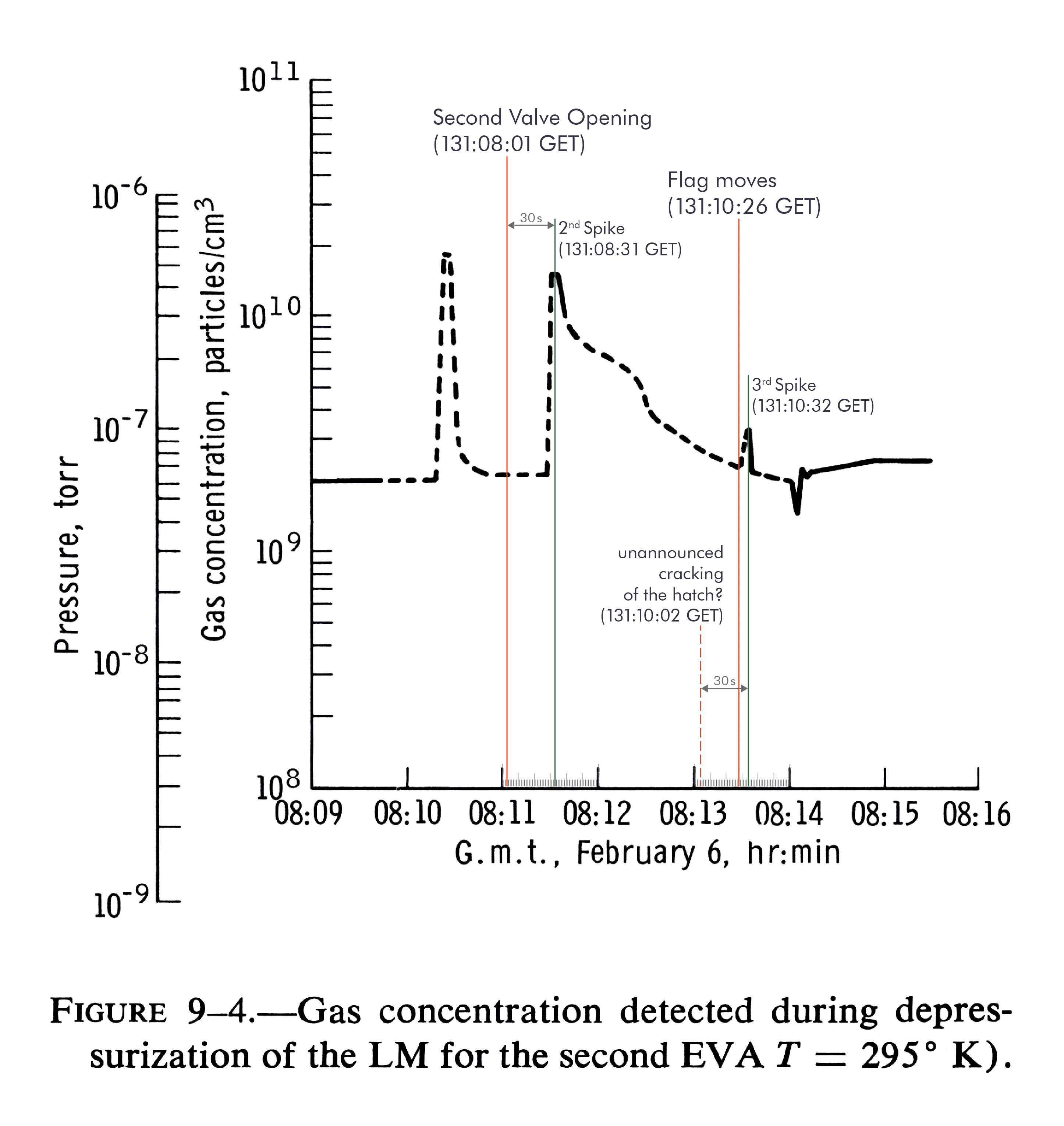 [Another example comes from CCGE (Cold Cathode Gauge Experiment) data for the Apollo 15 EVA-3 depressurization, recorded 110 meters northwest of the LM. The CCGE was co-located with the SIDE, which is shown in Figure 5-52 in the Apollo 15 Preliminary Science Report. As indicated in the Preliminary Science Report, "The CCGE (Cold Cathode Gage Experiment) was turned on at approximately 19:34 GMT/UTC on July 31, 1971. On initial activation, the gage indicated full scale; but, after approximately 30 minutes of operation, the output began to drop. The high voltage was then commanded off to allow the instrument to outgas. The gage has not been operated for prolonged periods during the lunar day because of voltage restrictions placed on the high-voltage power supply in the SIDE package. The experiment was operated four more times for periods of approximately 30 min each to observe the effects of the LM depressurizations for the second and third periods of extravehicular activity (EVA) and for the equipment jettison and to observe the effects of the LM lift-off from the lunar surface." CCGE data for the EVA-3 depressurization ( Figure 13-4 in the Apollo 15 Preliminary Science Report ) shows peaks at 'elapsed times' of 1:36, 2:17, and 5:38, corresponding to (1) the initial depressurization to 3.5 psi, (2) the second valve opening to complete depressurization, and (3) hatch opening. Although it is tempting to think that zero time corresponds to the reported time of the first valve opening, it seems unlikely that the flow would take 96 seconds to travel 110 meters in the Apollo 15 case versus 30 seconds to travel 180 meters in the case of the Apollo 14 EVA-2 depress. It seems more likely that zero time represents the start of data collection for this event. For the Apollo 15 EVA-3 depress, the relevant mission elapsed times are 163:17:32 for the first valve opening, 163:18:12 for the second opening, and 163:21:35 for hatch open. Dave and Jim did a good job of reporting what they were doing, and the uncertainties in the relative times seems small. The intervals are 40 seconds and 3 minutes 23 seconds, which compare well with the CCGE intervals of 41 seconds, and 3 minutes 21 seconds.]