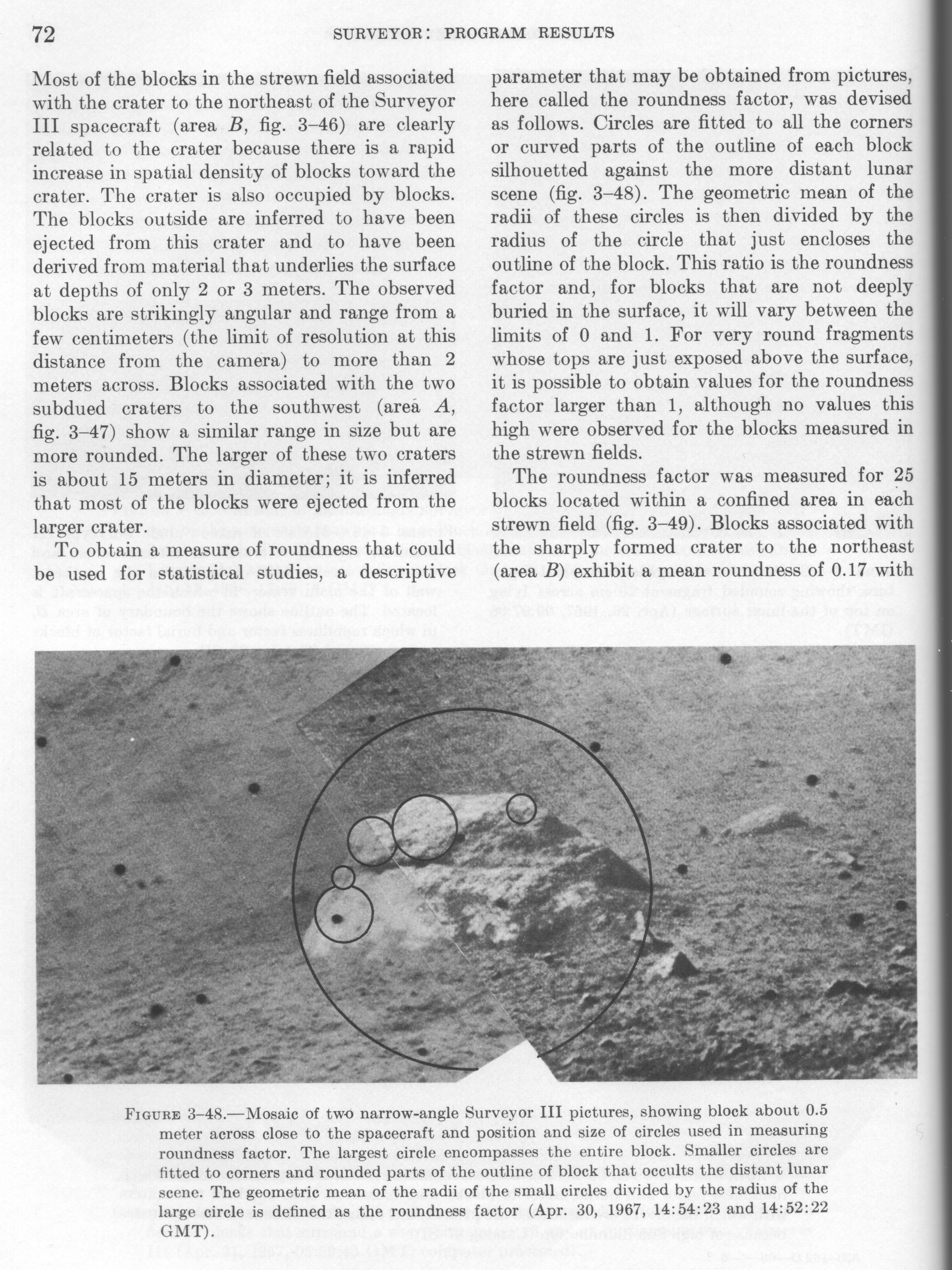 [The following is taken from the Apollo 14 Preliminary Science Report. "The Apollo 14 crew briefly described a raindrop pattern, similar to that previously described by the Apollo 12 crew, in the vicinity of Station A. This pattern is readily seen in all the panoramas, except B3 and C-Prime, and in some of the sample documentation photographs. The patterns are best illustrated by NASA photographs AS14-67- 9390 to 9393, which were taken at low sun angle during the first EVA (to document the football-sized rocks). The raindrop pattern on the fine-grained surface material appears to consist of small craterlets up to 4 cm in diameter. Shadows from very small fragments on the surface tend to enhance falsely the raindrop appearance in some of the photographs. The raindrop patterns are probably formed by impact of small meteorites and by secondary particles from these impacts. A raindrop craterlet 1 cm deep would be destroyed by subsequent impacts in about 3 million years, so that a fresh surface should become more or less saturated by 4-cm craterlets in this time span." The Apollo 14 geology team goes on to speculate on why the raindrop pattern is not so evident at the stops close to Cone Crater and cite possible destruction by downslope soil movement, the effect of a coarser ground surface that might impede formation of the pattern, and the effect of a different Sun angle on the slopes of the Cone ridge relative to the flatter surfaces closer to the LM.]
