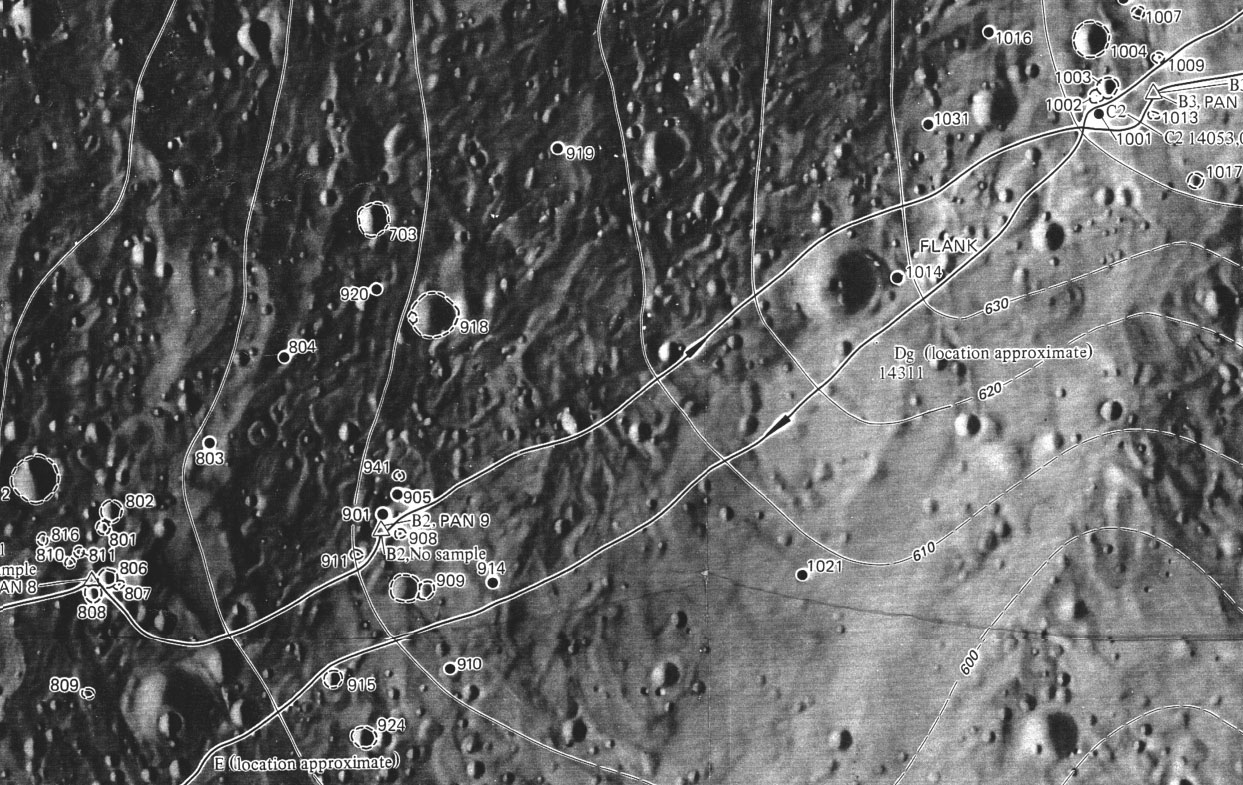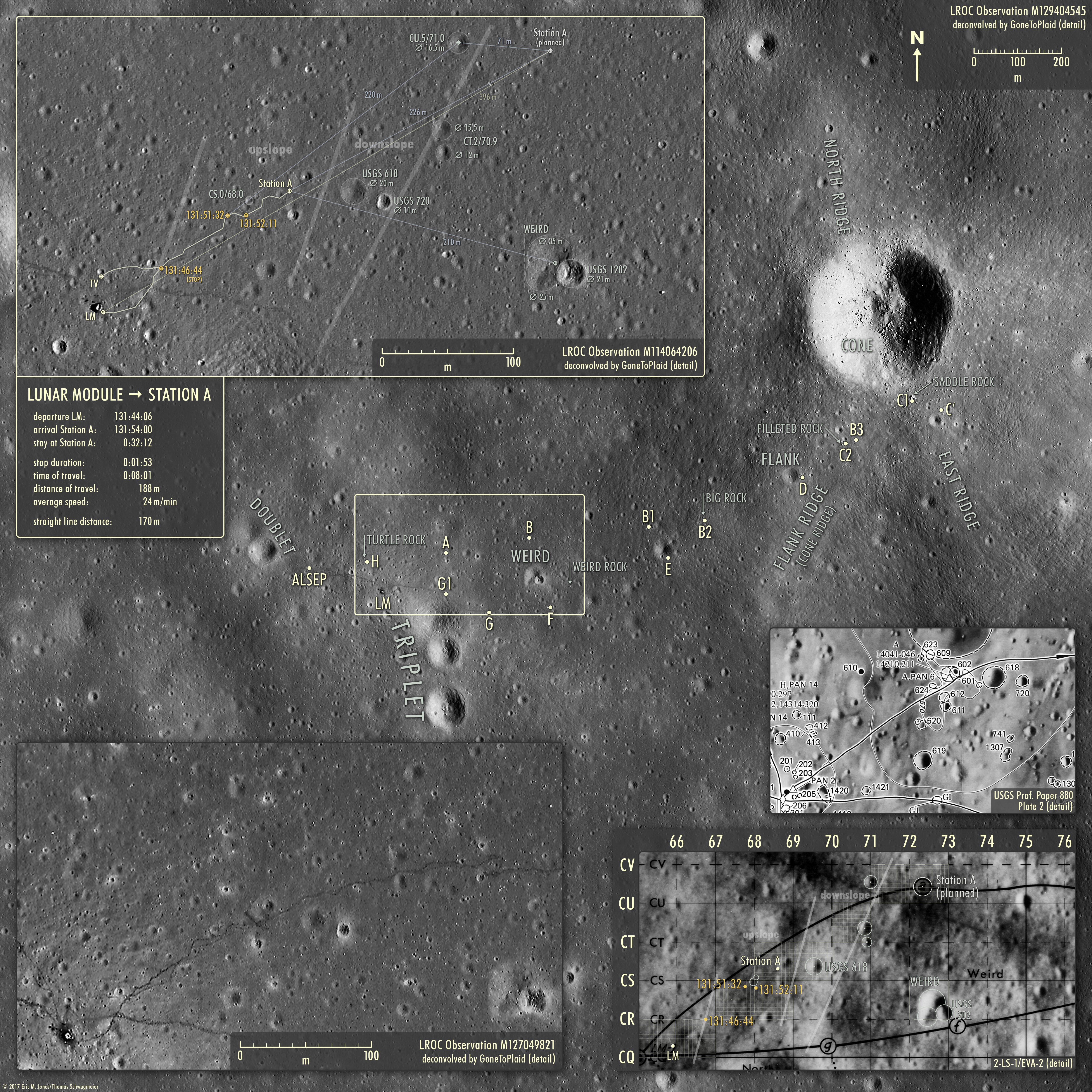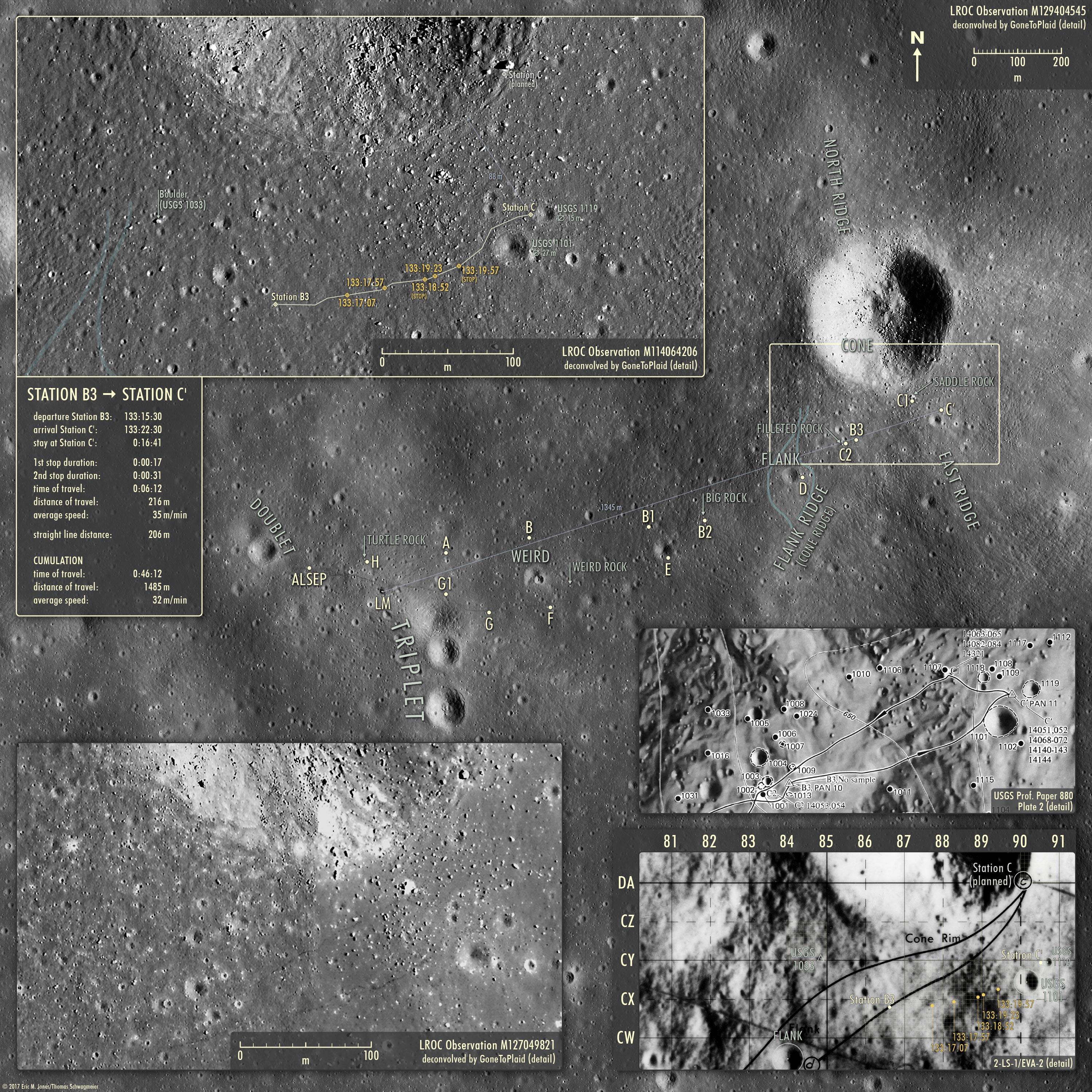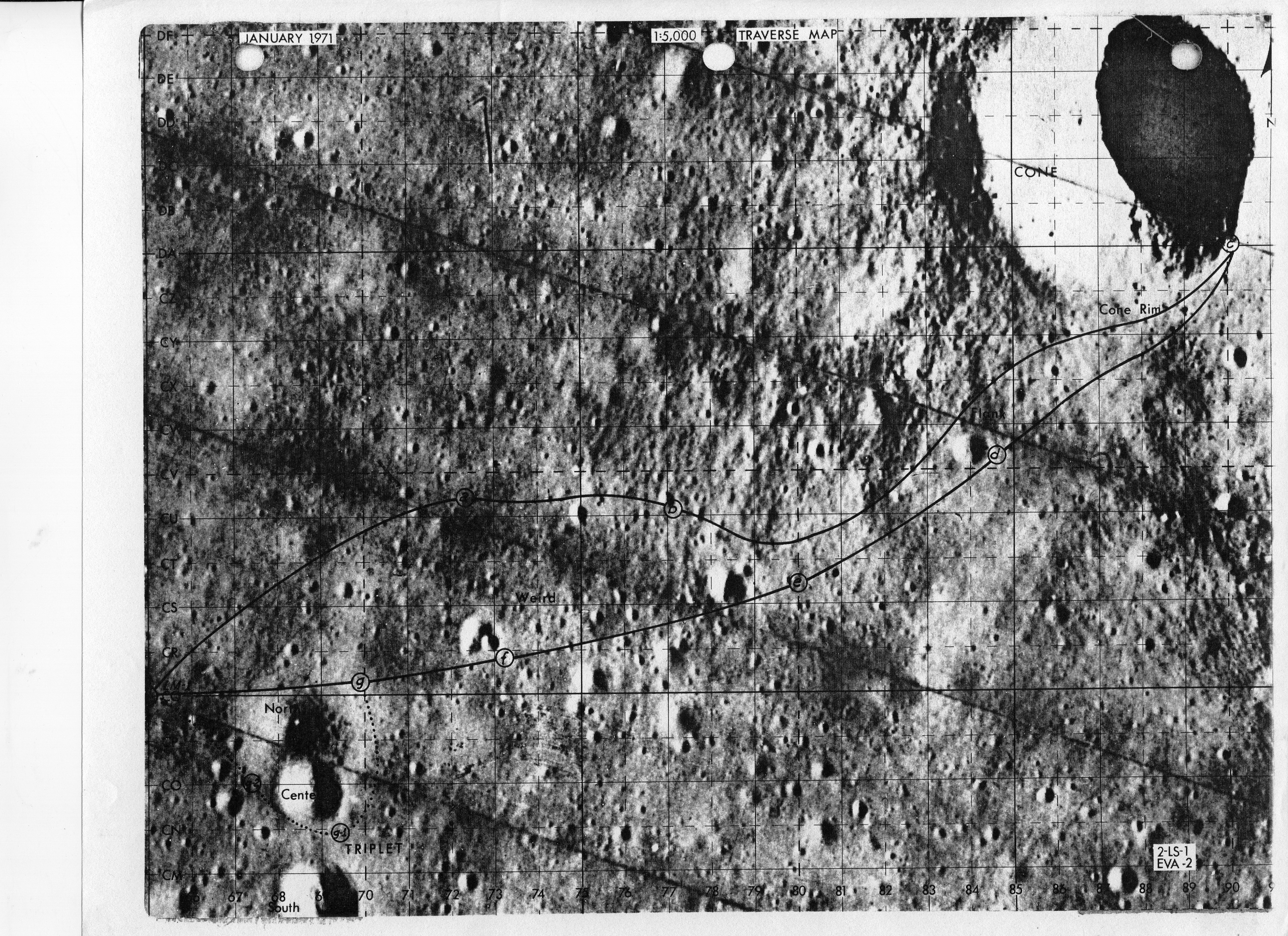 [Brian McInall has produced a planimetric map of both EVAs using LRO imagery.]132:26:17 Haise: Okay. And we still need an EMU check from Ed.
