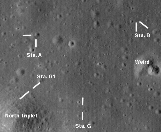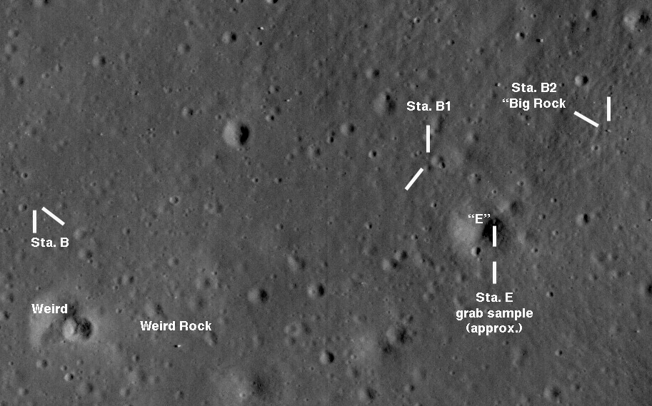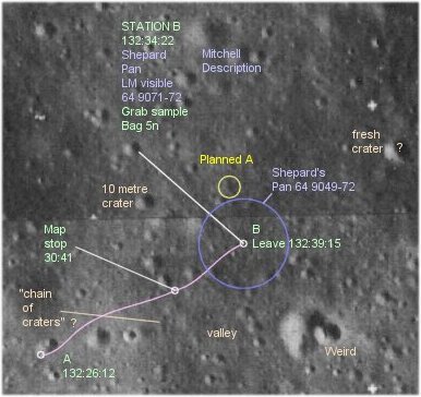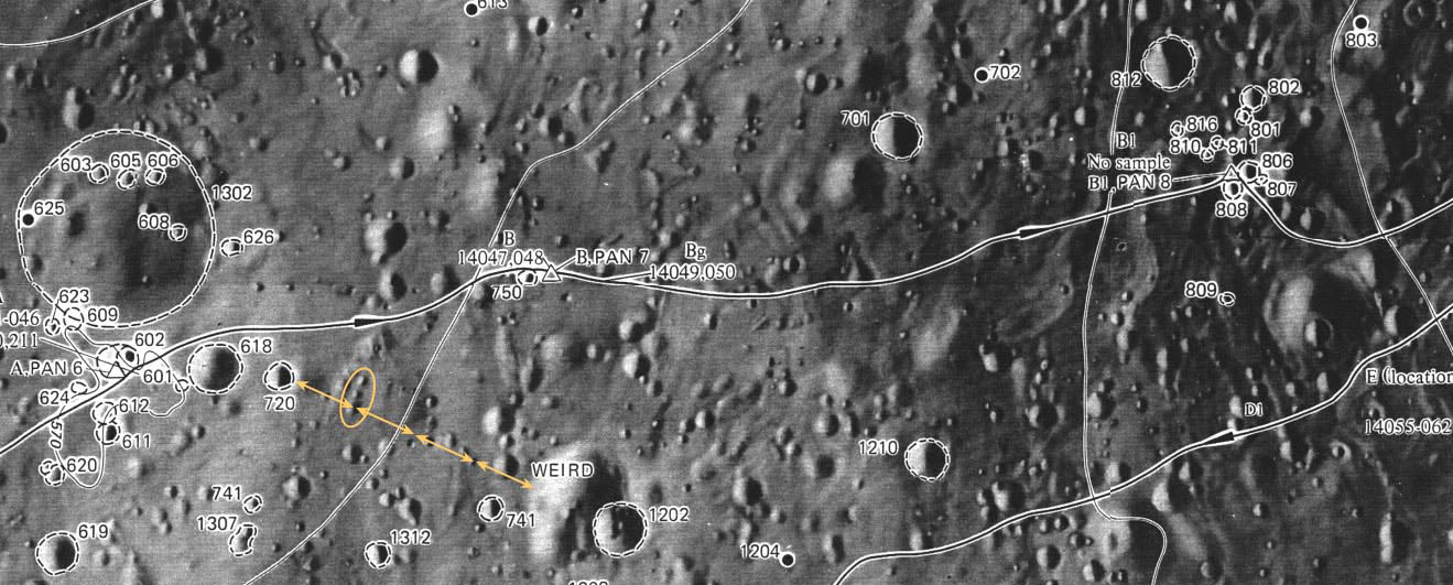[According to post-mission analysis, they will do Station B near CT.1/72.3, about 75 meters south of the planned Station A location and about 90m north of Weird. If we make the likely inference that Al thinks they are north of Weird, he is correct. Ed thinks they are 200 meters farther east, near the planned Station B.]132:31:59 Mitchell: That's Weird, that big one right over there, Al.