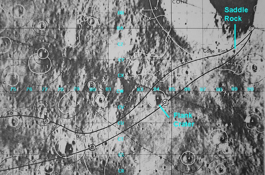 [Ed has a reasonable idea where they are and, in the area south of Cone, several of the largest boulders - such as the one at CY.6/89.0 ( 0.8 Mb ) - are visible, even on a photocopy of the map. As it turns out, the boulder at CY.6/89.0 - now known as Saddle Rock - is at Station C1.]133:22:37 Haise: And, Al and Ed, do you have the rim in sight at this time?
