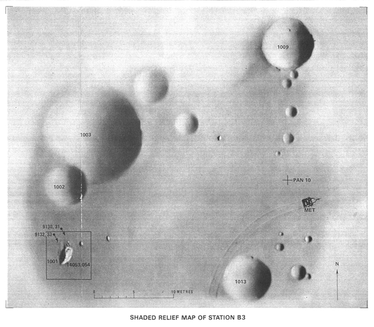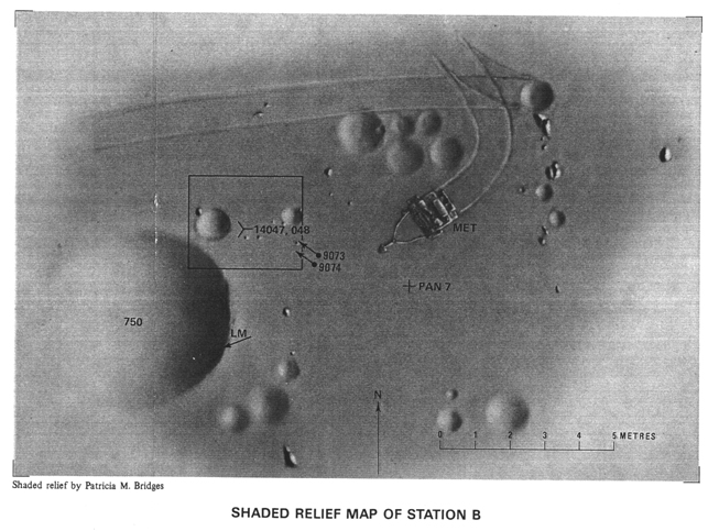 [Comparing the post-mission map (229k) with the pre-flight map (0.6 Mb), we can determine that they did Station B at about CT.1/72.3, rather than the planned location of about CU.1/77.1. If they made the map stop near CT.1/71.3, they have gone about 80 meters. One reading of the transcript is that, after stopping to examine the map with Ed at 132:30:41, Al started moving again at 132:31:50. If Al actually reaches B at, say, 132:34:15, he had 2 minutes 25 seconds to cover the 80 meters. That implies an average speed of 33 meters per minute (2 km/hr), which is a little faster than their overall progress to this point in the traverse. A longer map stop by Al would imply a greater travel speed over the 80 meters. A USGS shaded relief map of the immediate area around Station B gives the relative positions of the MET, the various craters, and the sample locations. Scan by Brian McInall. See, also, a detail (0.3 Mb) for the 28 November 2009 LROC image, which has a resolution of 0.5 meters.]132:34:07 Haise: Okay. And, Al and Ed, this is a grab sample at B, and we need the panorama. And while somebody's doing that, we can get a site description.