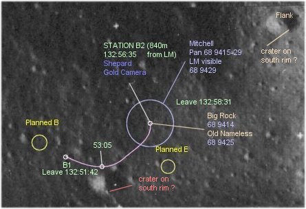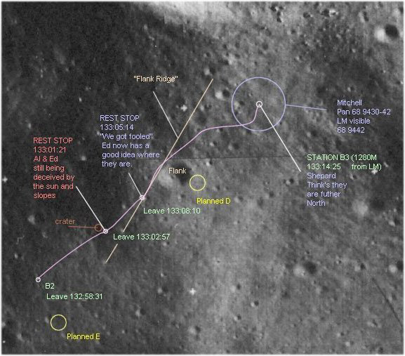 [Shepard, from the 1971 Technical Debrief - "I felt that we had a navigation problem on EVA-2. I don't know why we didn't worry a little bit more about that pre-flight. We did discuss the fact that points A and B were not very well defined. They said, 'Well, it wasn't too important to get exactly to those two points from a geological point of view.' This may be true, because we're supposed to be in contact with nondescript material. But it sure made it tough to figure out exactly where we were as far as the progress of the EVA was concerned."]MP3 Audio Clip by Ken Glover (45 min 53 sec)[Mitchell, from the 1971 Technical Debrief - "Yes."]