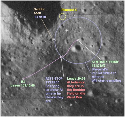 [From evidence gained in terrestrial experiments with craters formed by explosives and impacts, the closer one gets to the rim, the greater the depth from which the ejecta was derived. A climb to the very rim would, then, offer the best chance of getting samples of the underlying bedrock - not to mention the view into the crater and the fact that the rim was a readily defined goal, akin to the summit of a mountain.]133:09:37 Haise: We establish...(Pause)[Mitchell - "We're not really in a pissing contest but what I'm trying to do is angle us...If this is where we turned out to be (a little short of B3), Al's trying to get us to this boulder field here (at C-Prime) and I'm trying to get us to go this way (north). Because I'm pretty sure we're angling too far to the east here. I am now pretty confident of where the edge of the Cone is, and to get to the boulder field Al is talking about, which is kind of where we ended up, it would have been shorter to go right on straight up the hill, because the bigger boulders and everything are right there. So it's all of this confusion that got into where the heck we were, in here...Al had one (mental) picture; I had another. So we got into a little disagreement here, but I'm becoming pretty certain that we should go this way, we end up going here and, of course, as it turns out, when we stop here at C1, we're only 50 feet from looking into that damn thing."]