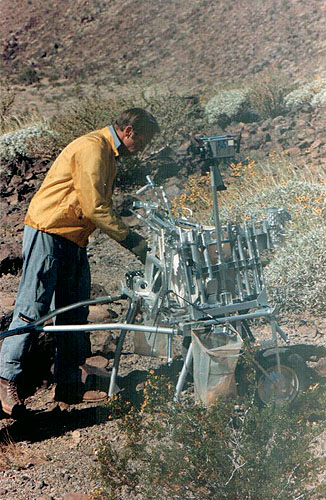 [The wire-mesh wheels of the Lunar Rover flown on the later missions did throw up a rooster tail, albeit with the vehicle moving at speeds of up to 10-12 km/hr, compared with the far more modest 2 km/hr of the MET. On both Apollos 16 and 17, a rear fender was accidentally torn off and both crews were subsequently sprayed with dust. Because that dust reduced the amount of sunlight being reflected off the battery covers, various mirrored radiators, and other surfaces, it created thermal problems and had to be brushed off at regular intervals.]
