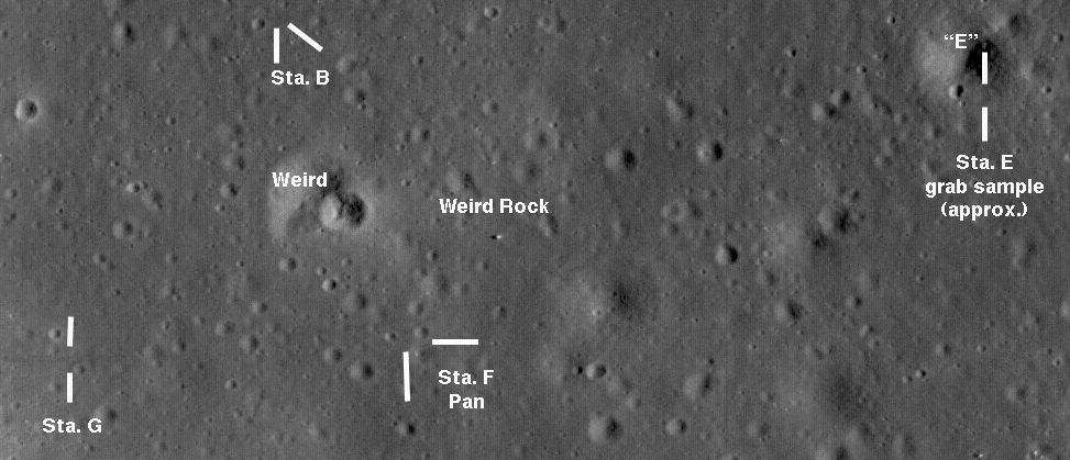 [Weird Rock is visible on the traverse map at CR.0/74.3 ( 0.6 Mb ) and, also, in AS14-64- 9146, a frame in the pan that Al will take at Station F. Note that, in Al's Station F pan, which he takes at 134:07:18, the MET tracks do not go near the boulder, confirming that it was Al who took the boulder photos.]