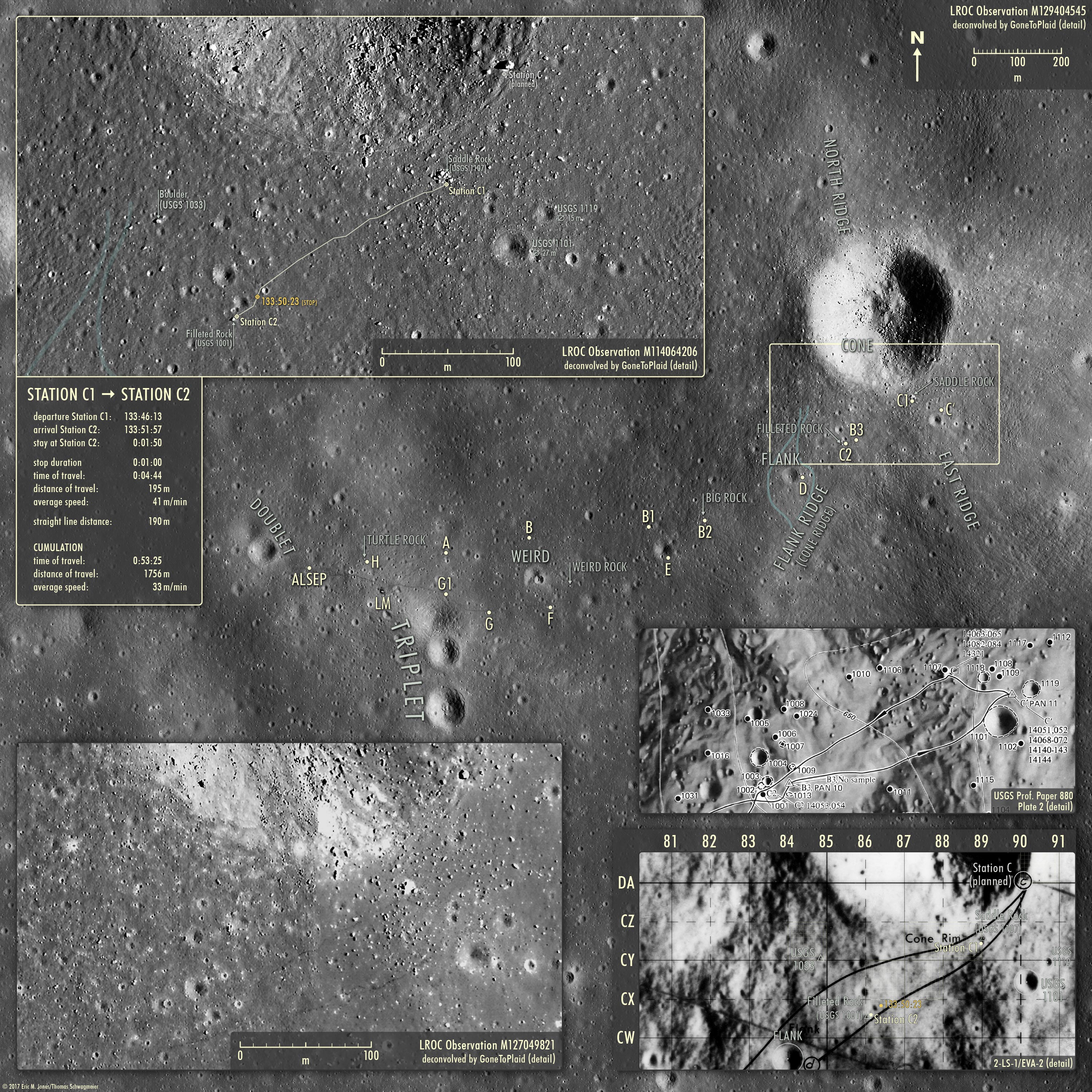 [The first part of the trip back to the LM is covered by the C1-to-C2 traverse map.]133:47:11 Shepard: Okay. (Pause) Okay, these rocks, or these boulders, in this field here appear to be very weathered, obviously not by (chuckles) atmosphere, but eroded by some process, because they all show cracks. They show evidences of being broken up either by impact or subsequently. And it looks to me as though these rocks are really pretty old.