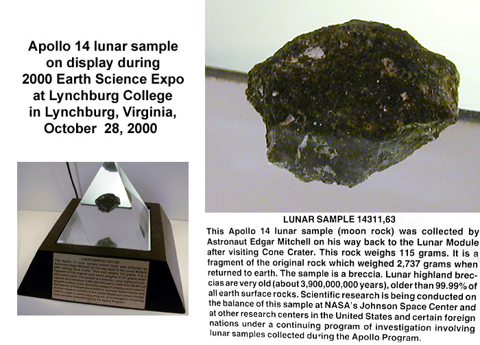 [This is sample 14311, a 3.2 kg breccia which broke into four pieces prior to its arrival in Houston. A 115-gram fragment (14311,63) has become a NASA display sample and was photographed by Kipp Teague while it was on exhibit at Lynchburg College, Lynchburg, Virginia on 28 October 2000.]133:56:35 Haise: Roger. And one other question that's up here is to check for the stratigraphy reported earlier of the light gray-white layer below the top, if you see that exposed anywhere.